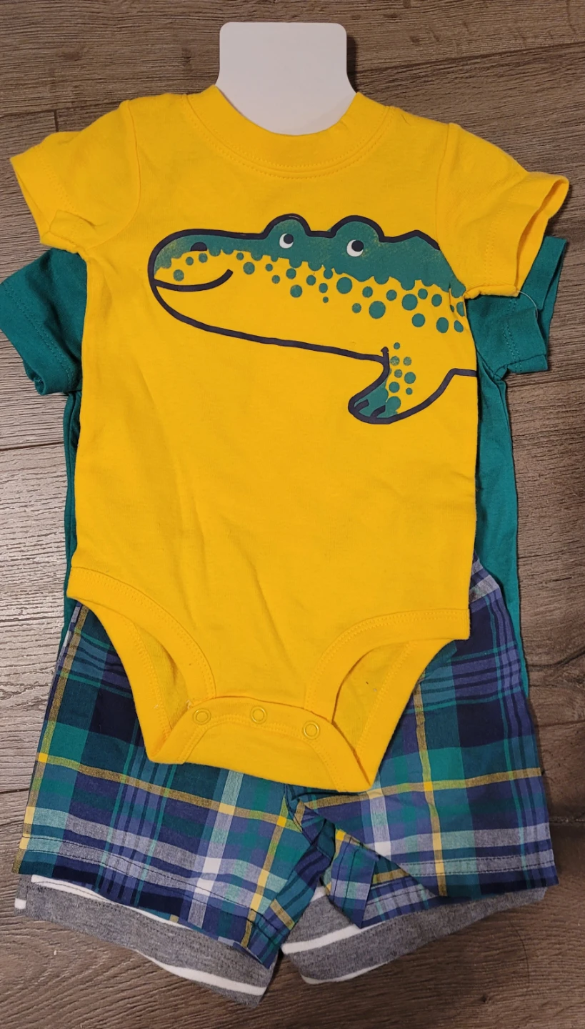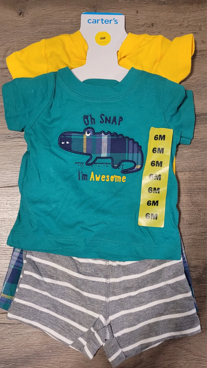 This cute Carter's 4-piece outfit set includes a teal graphic t-shirt with "Oh Snap I'm Awesome" text and an alligator design, a yellow bodysuit with a large alligator graphic, plaid shorts and grey striped shorts. All items are size 6 months. It's perfect for your little one!