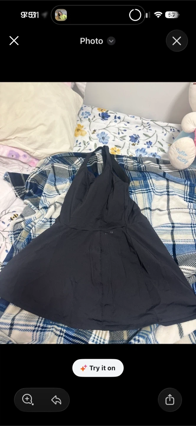 Black athletic dress with a built-in shelf bra and flared skirt. It's made of a lightweight, breathable fabric. This dress is perfect for tennis or golf! Size small pick up cash only