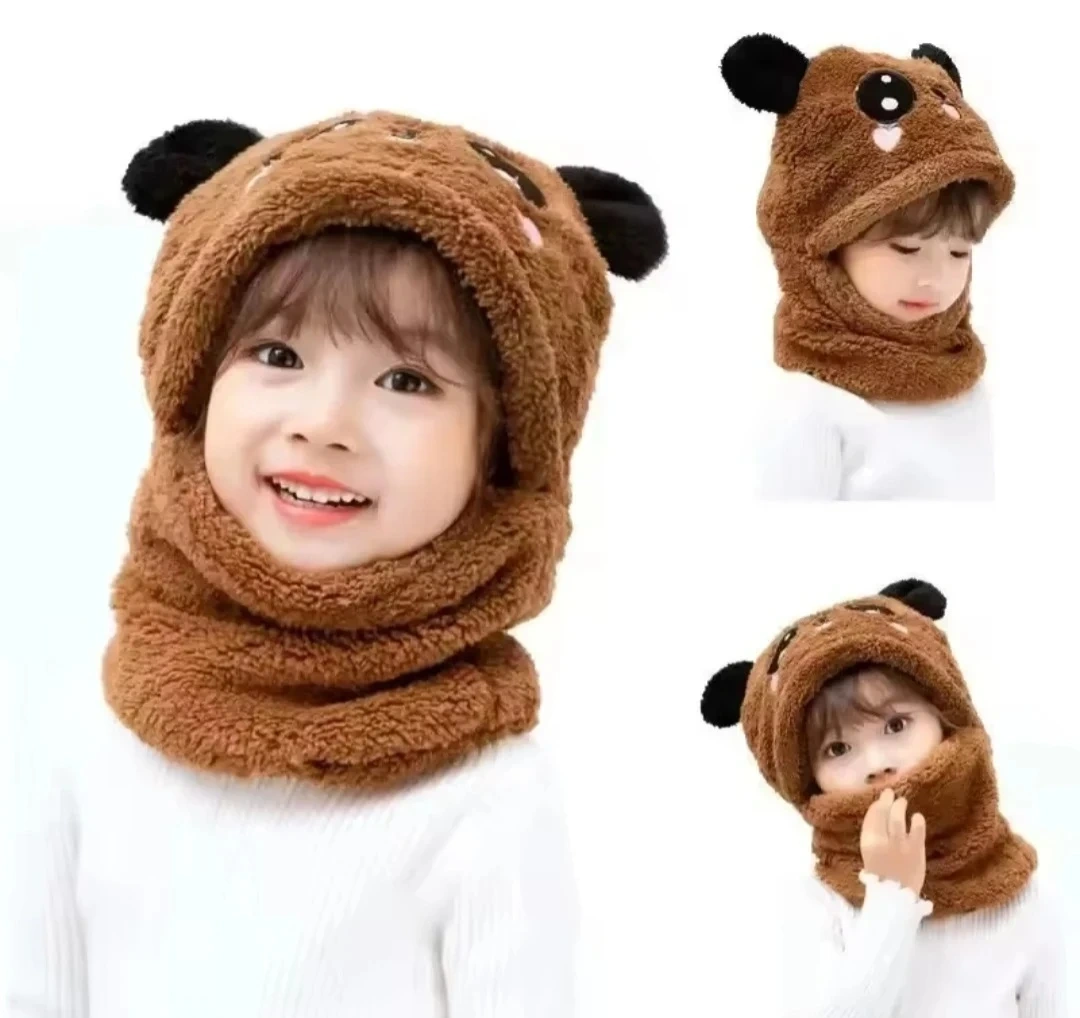 This cute brown bear hat and scarf set is made of soft fleece material. It has little bear ears and embroidered details. It's great for keeping kids warm and cozy!