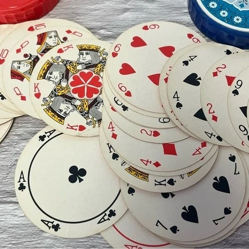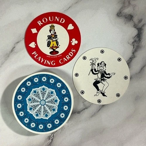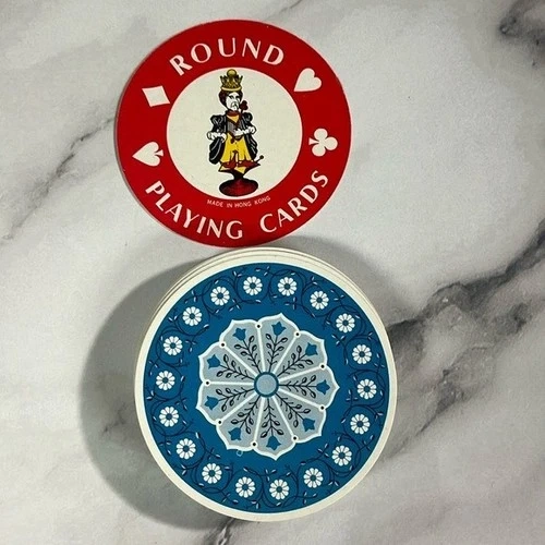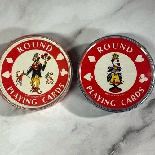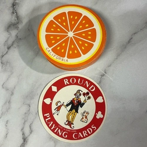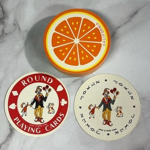 Vintage Round ABC Playing Cards. Made in Hong Kong. In great condition - used. 2 Full decks with 2 jokers per deck. A fun and unique California souvenir round playing card deck, featuring a bright orange fruit graphic on the front. This 3" circular deck comes with its original plastic case, making it a perfect collectible or gift for travelers, card players, and vintage memorabilia enthusiasts. Made in Hong Kong, this deck reflects the classic souvenir style of the mid-century era.