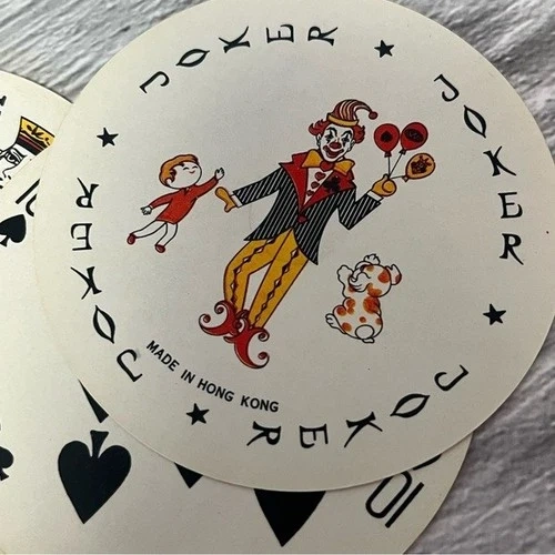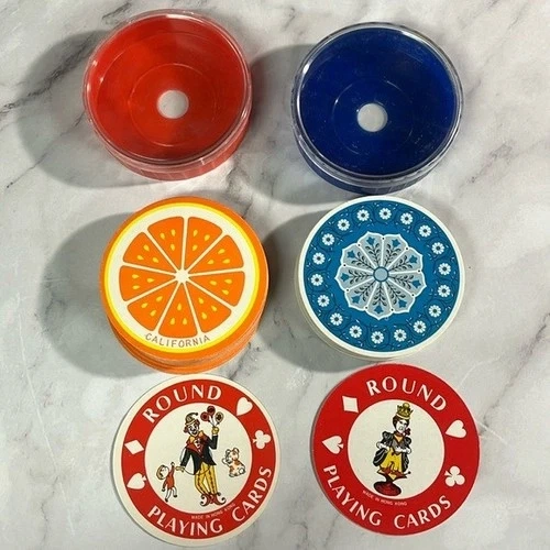 Vintage Round ABC Playing Cards. Made in Hong Kong. In great condition - used. 2 Full decks with 2 jokers per deck. A fun and unique California souvenir round playing card deck, featuring a bright orange fruit graphic on the front. This 3" circular deck comes with its original plastic case, making it a perfect collectible or gift for travelers, card players, and vintage memorabilia enthusiasts. Made in Hong Kong, this deck reflects the classic souvenir style of the mid-century era.