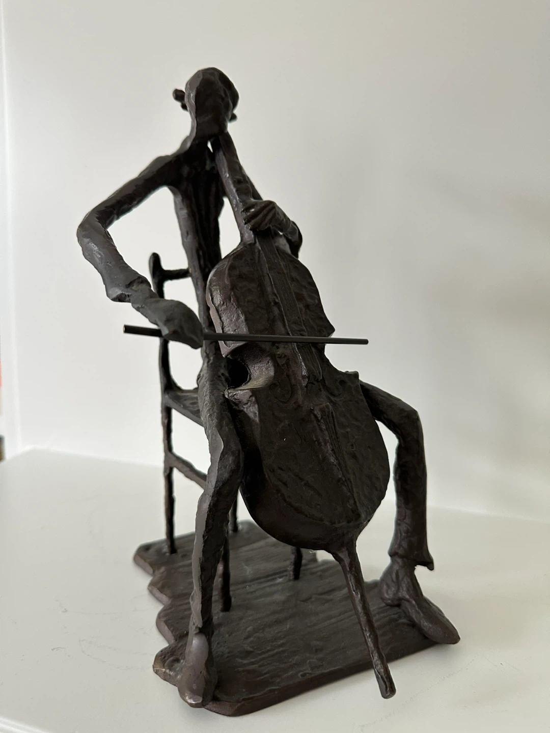 This unique sculpture depicts a figure playing the cello. It's made of bronze with a dark patina. The art piece showcases a seated musician with expressive form. It's a striking decorative item for any music lover!
