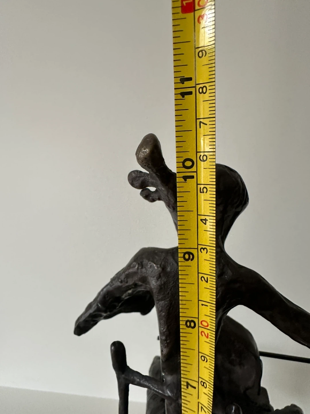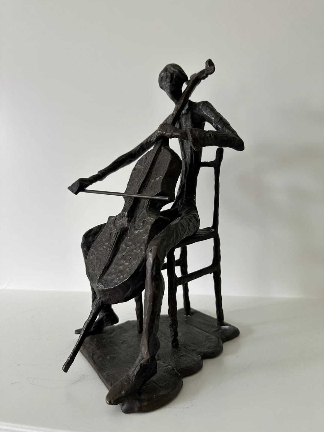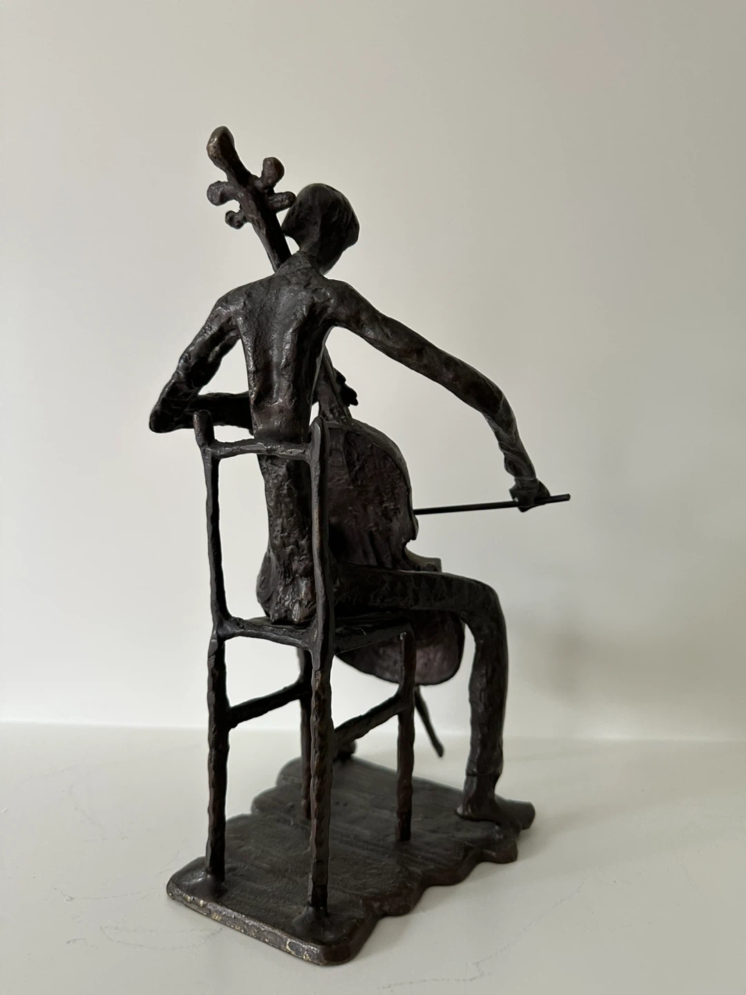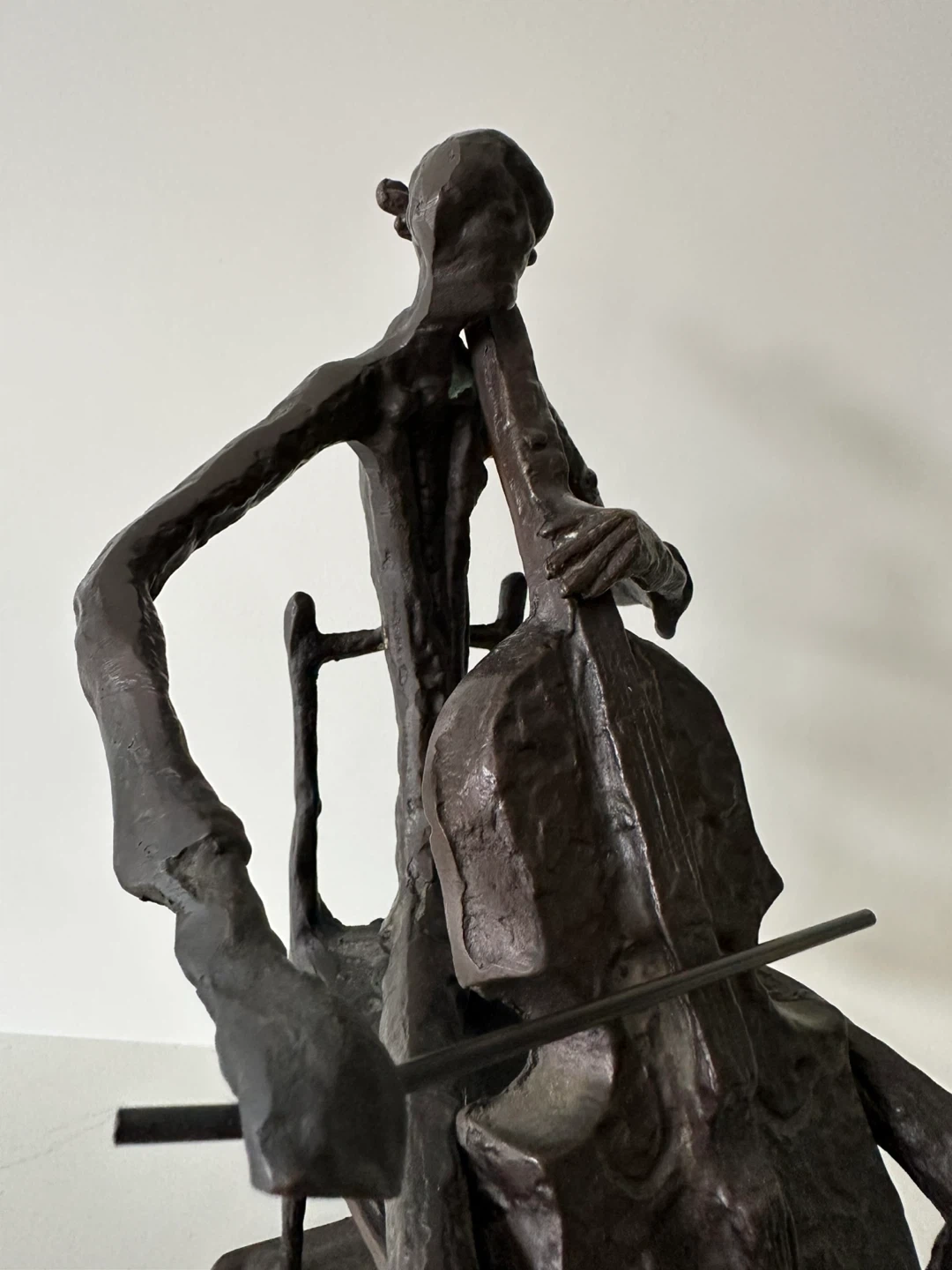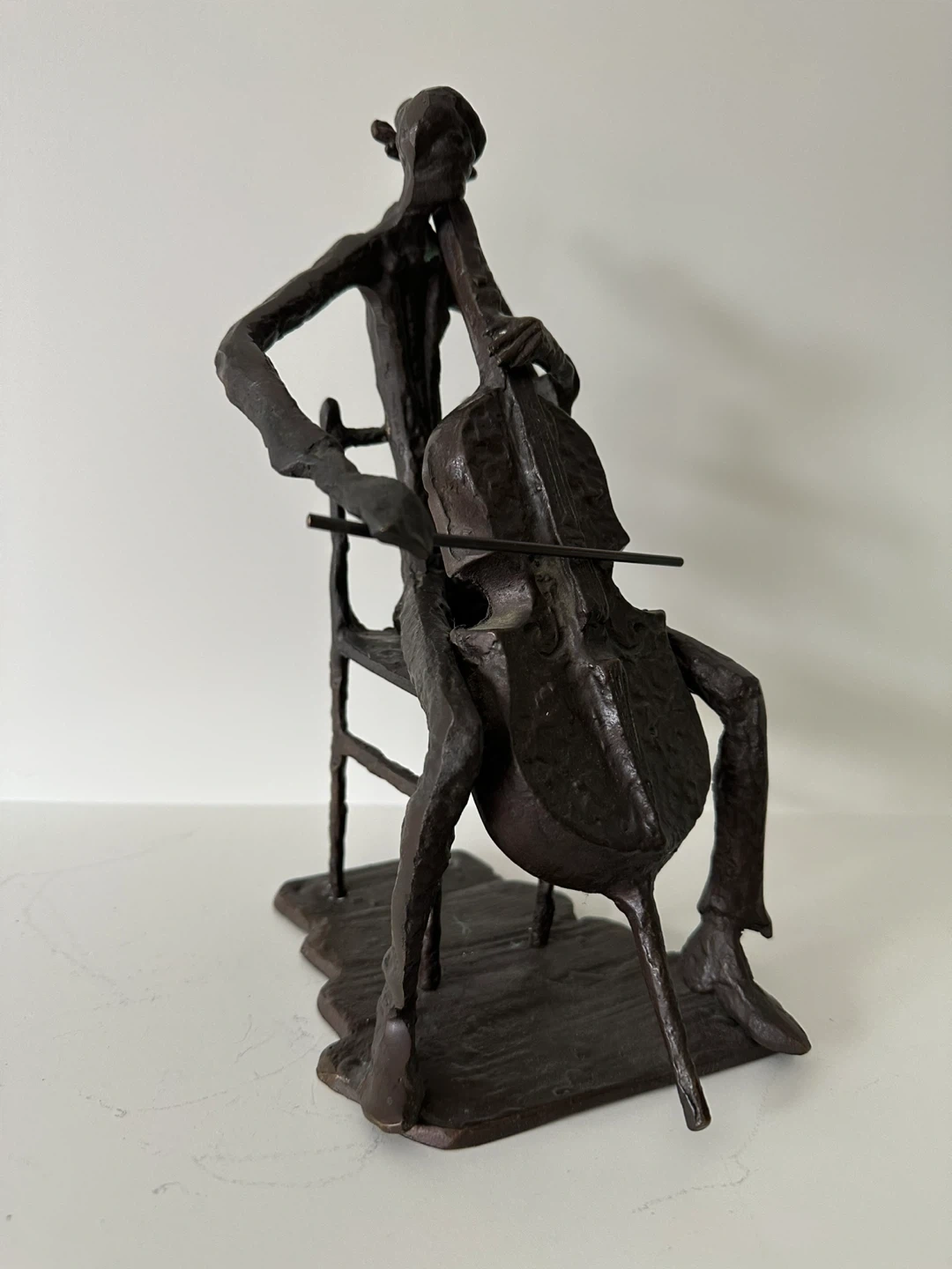 This unique sculpture depicts a figure playing the cello. It's made of bronze with a dark patina. The art piece showcases a seated musician with expressive form. It's a striking decorative item for any music lover!
