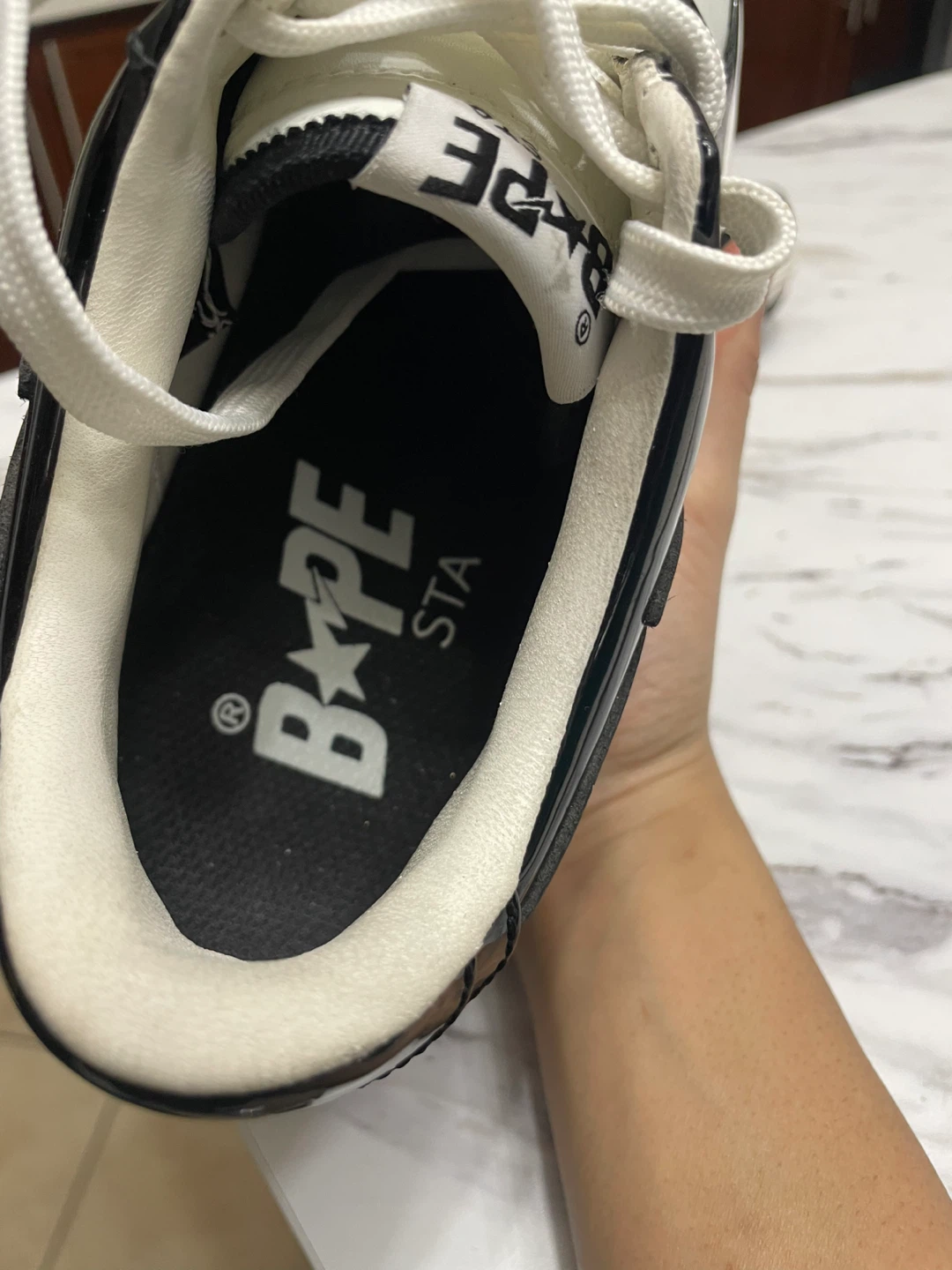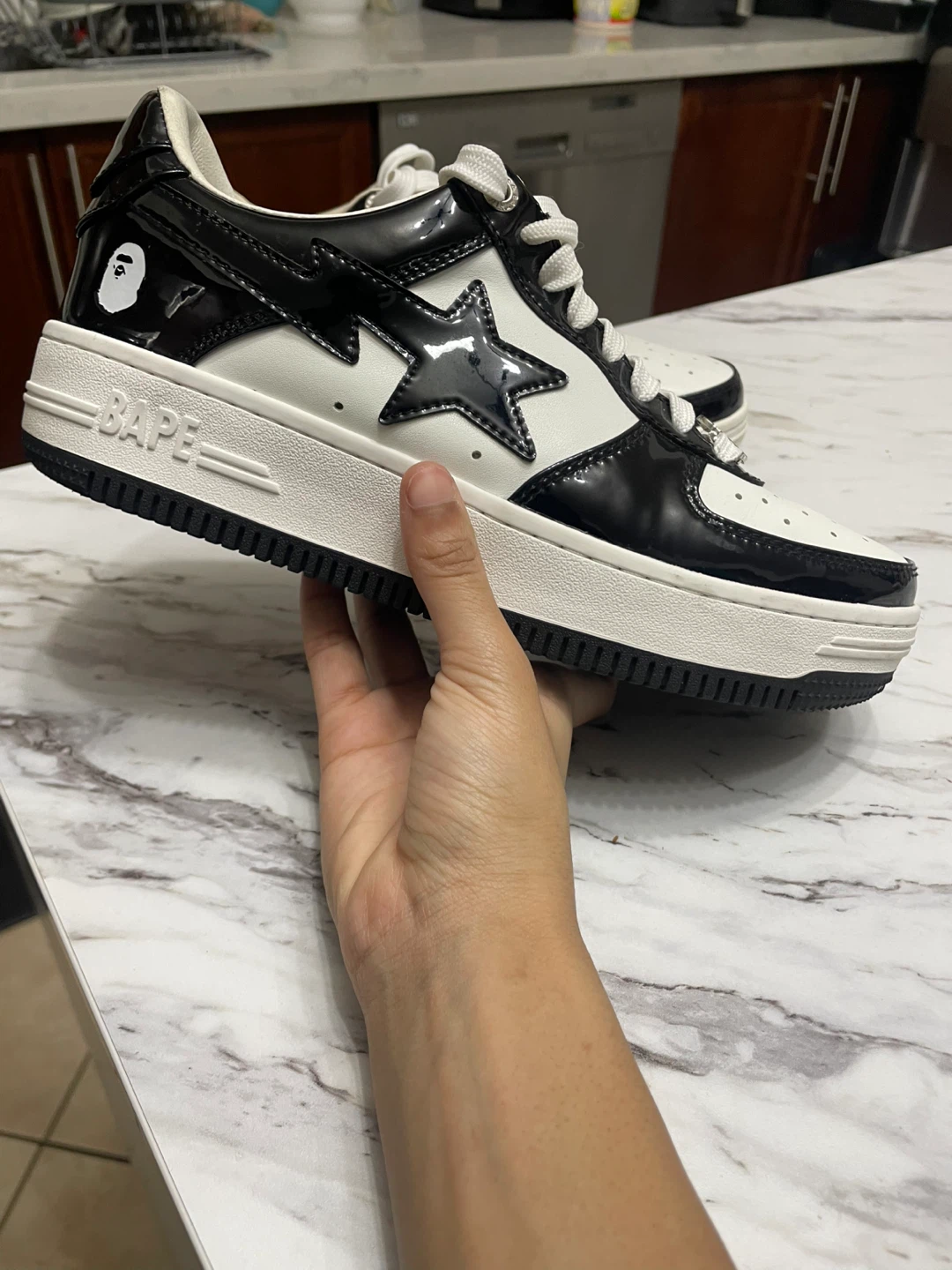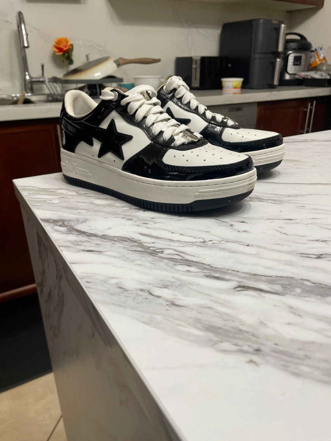 Classic BAPE STA sneakers in black and white. Leather and patent leather construction. Features the iconic star logo and BAPE branding.