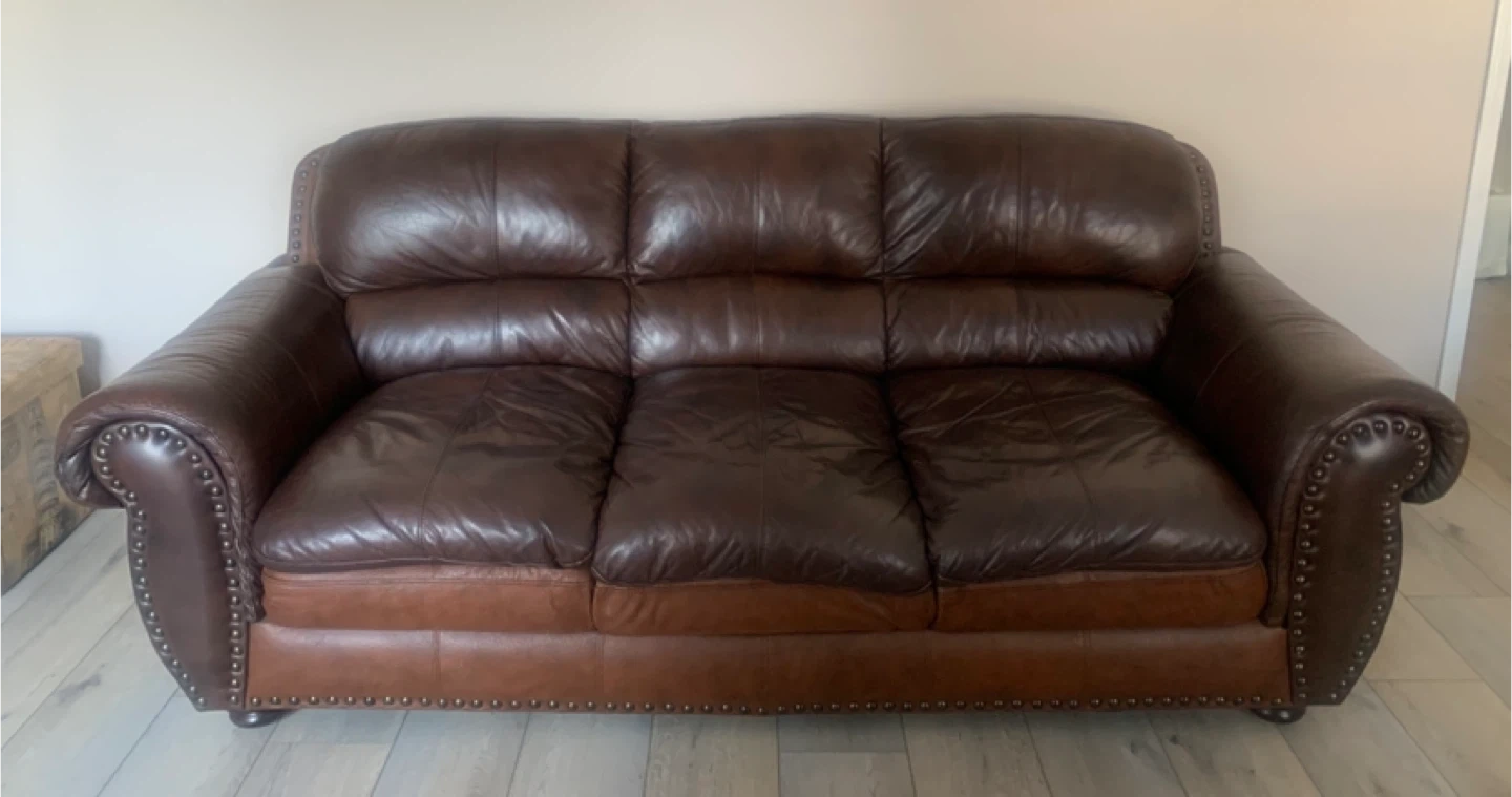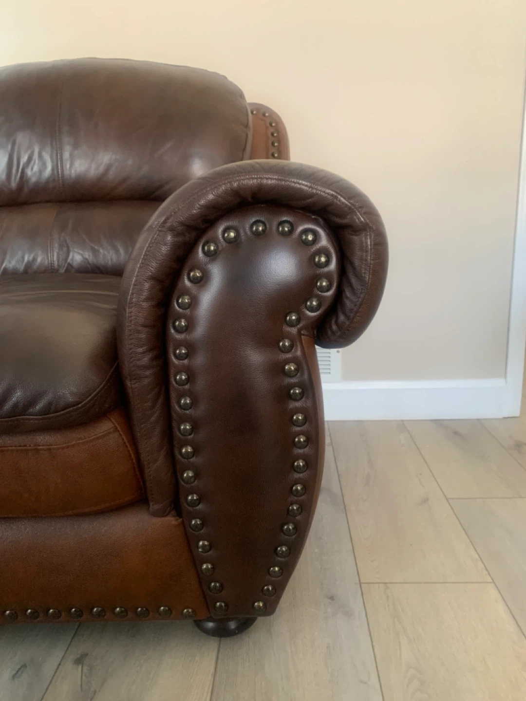 Two 3 seater Comfortable brown leather sofa. Classic design with studded accents on the arms. Made with genuine leather. Plenty of seating space for your family or guests!