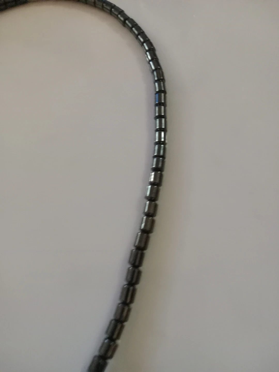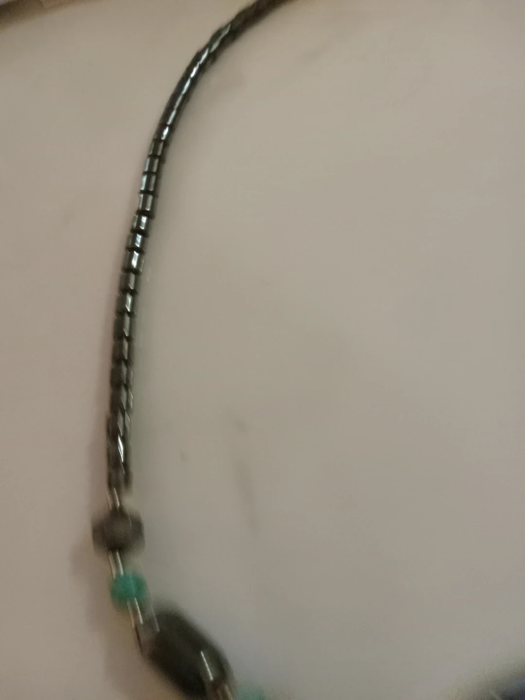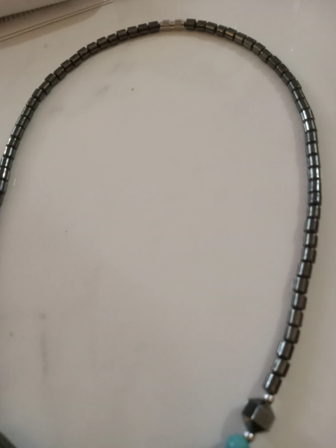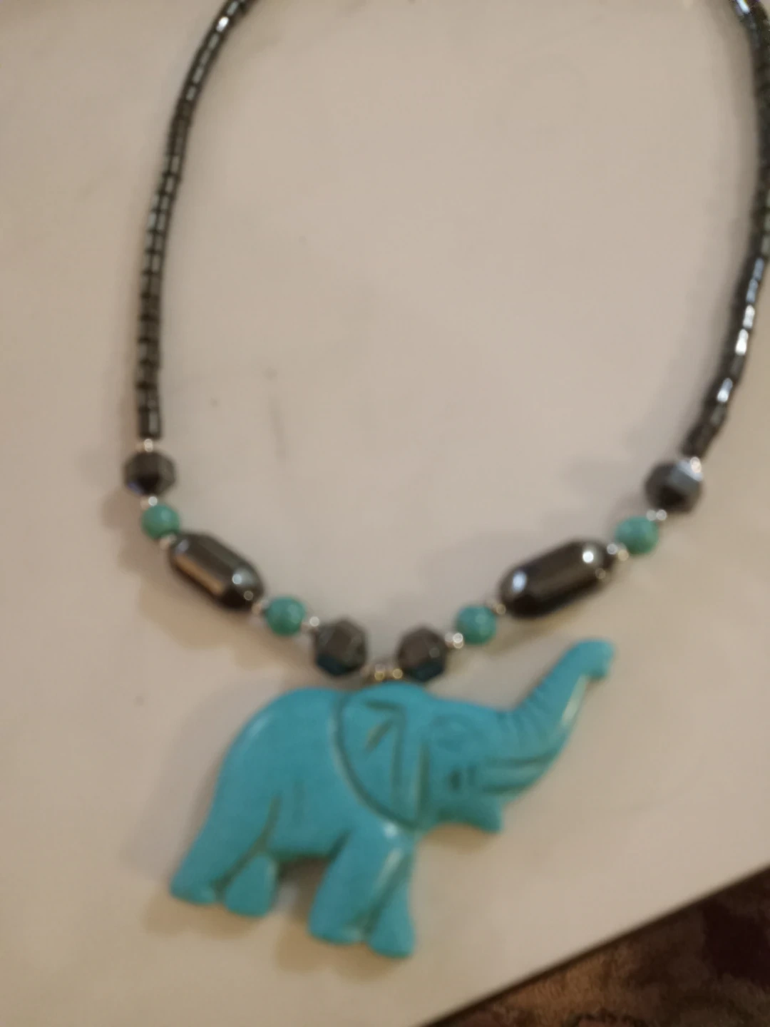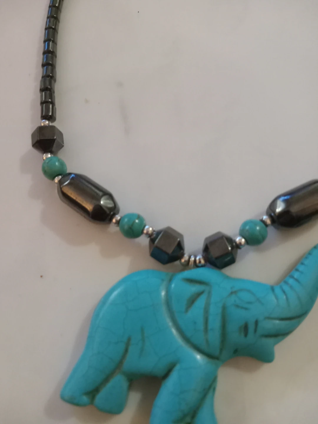 This necklace features hematite beads and turquoise-coloured elephant pendant. It is in good condition and ready to wear!
