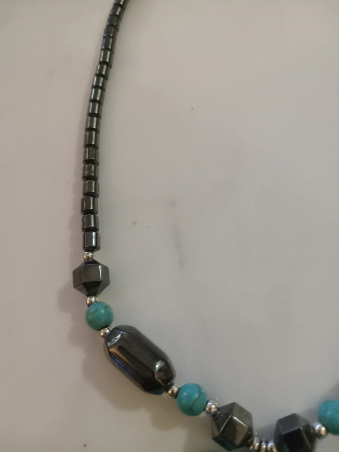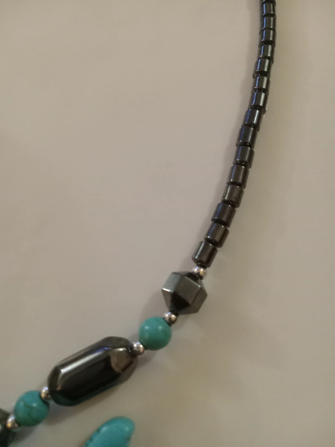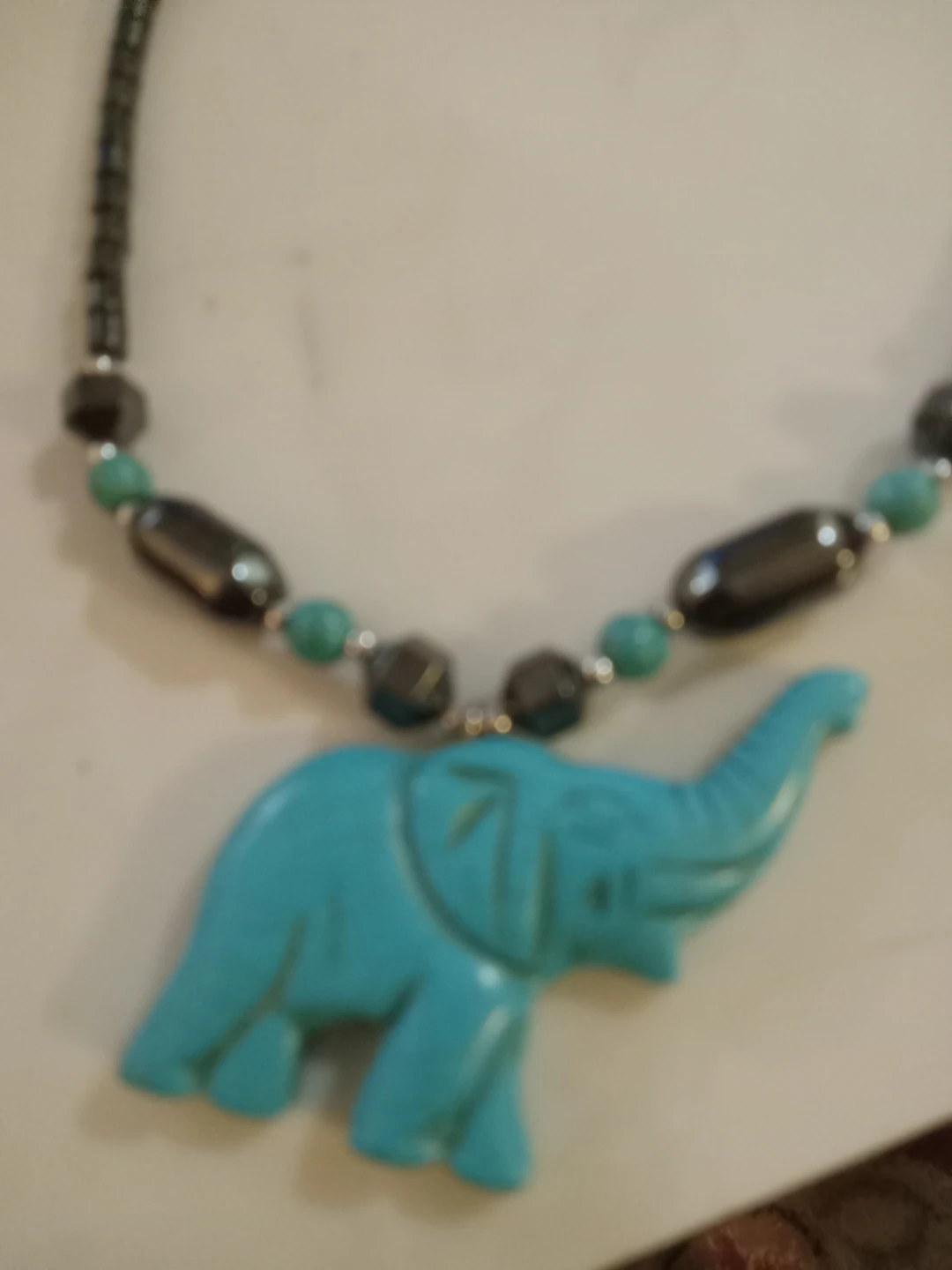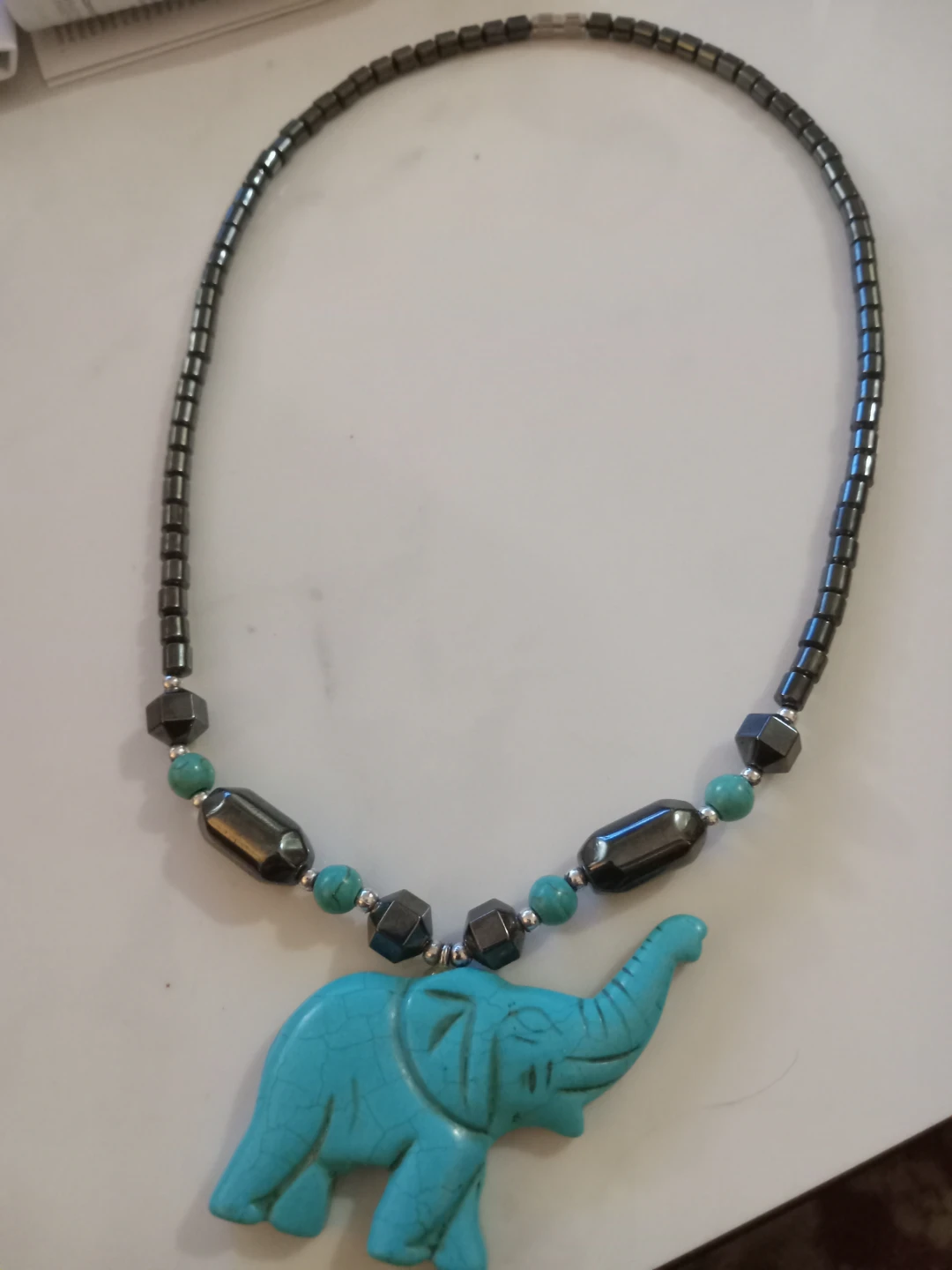 This necklace features hematite beads and turquoise-coloured elephant pendant. It is in good condition and ready to wear!