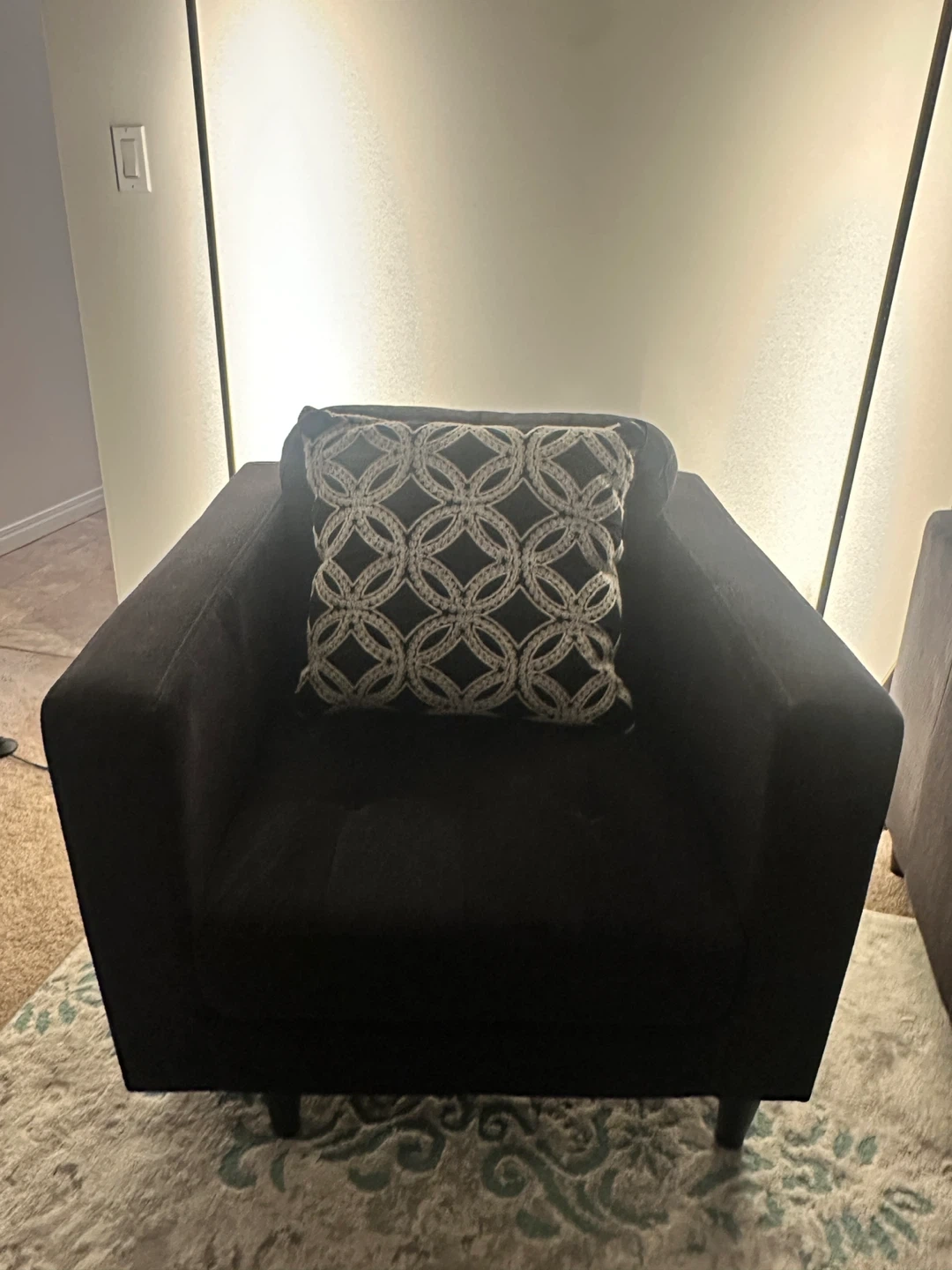 A comfy accent chair in a dark colour. It comes with a patterned throw pillow. Chair and pillow fabric appears to be a soft material.