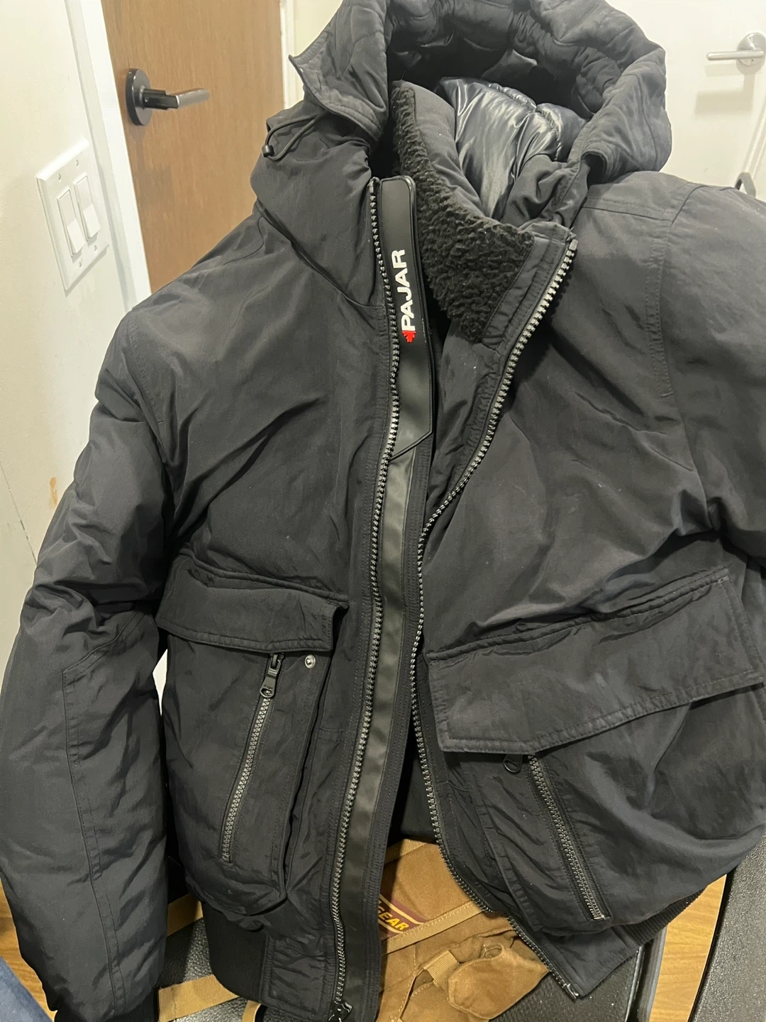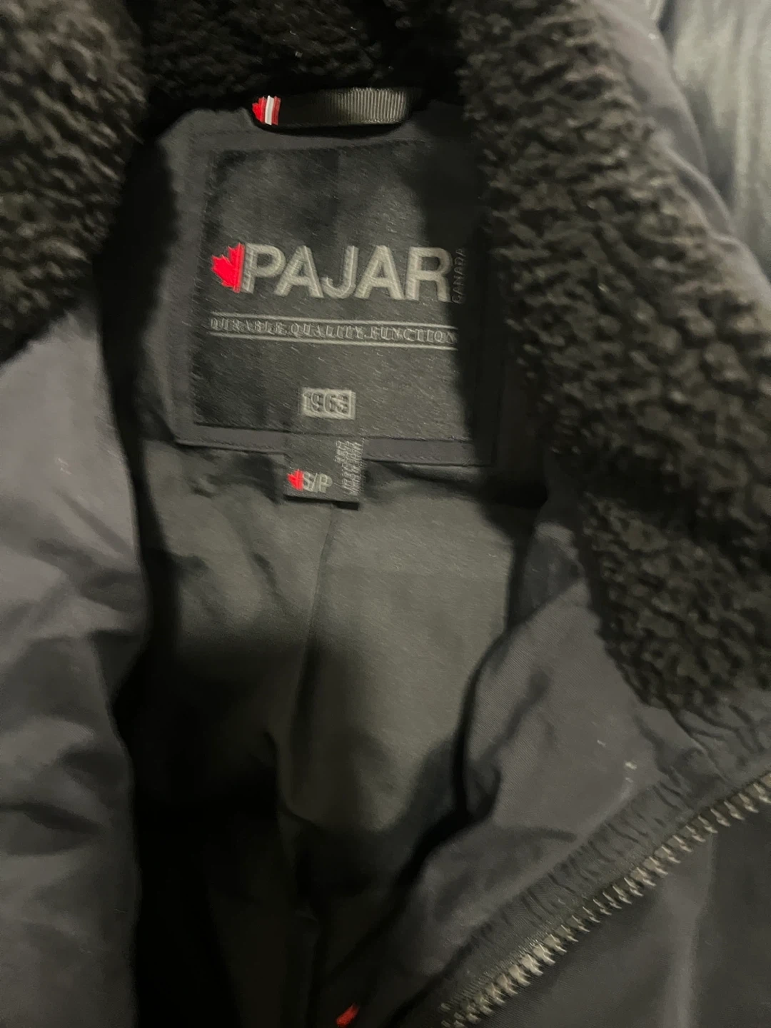 This is a Pajar winter bomber jacket in black. It's a size S/P. The jacket is made of durable material and features a cozy sherpa collar lining. It's designed for warmth and protection against the elements.