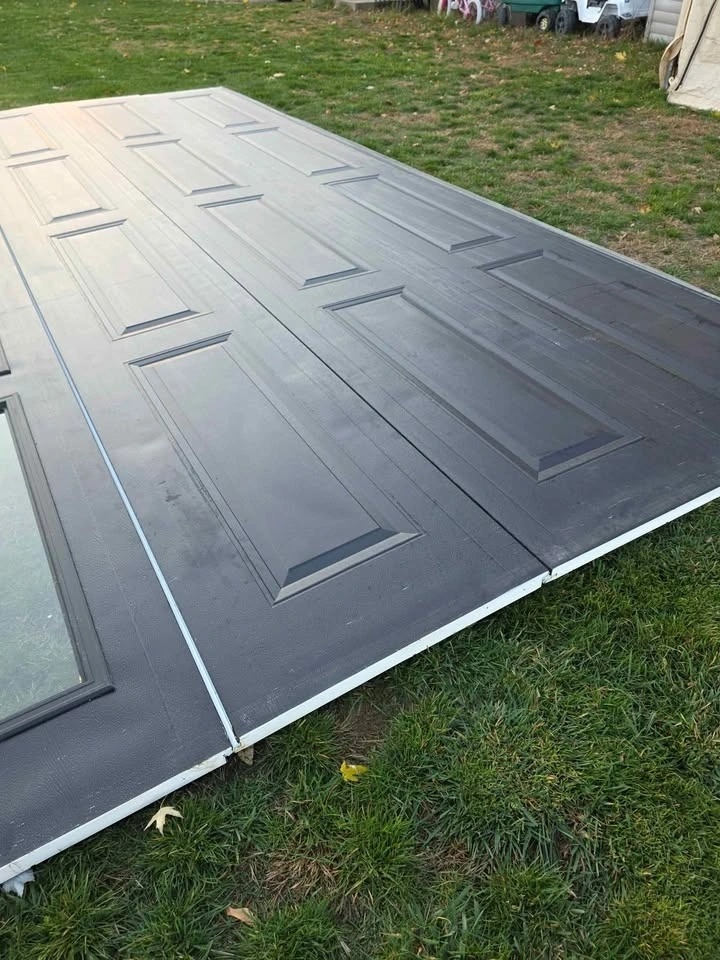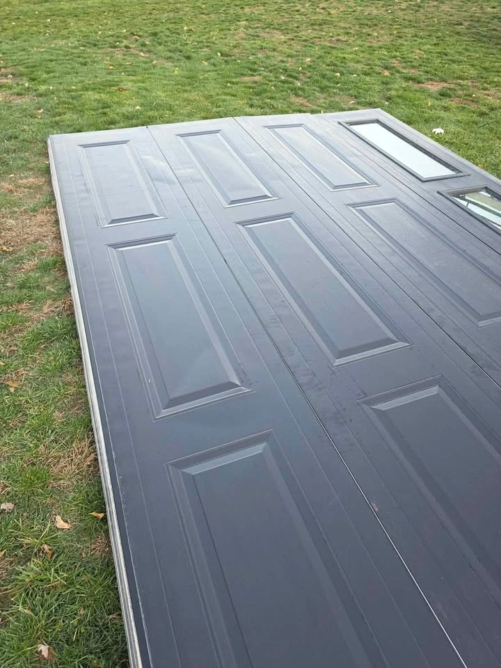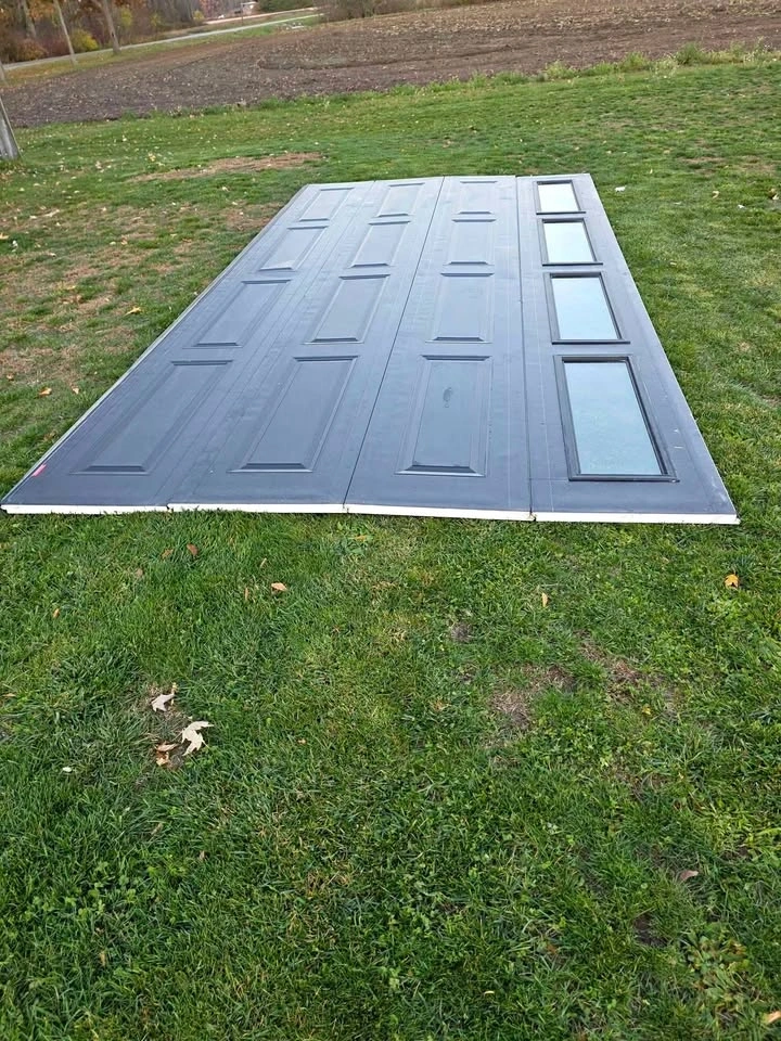 Used 16x8 garage door (16ft wide by 8ft high) made in Canada by Garaga. Black, polyurethane insulated R12 with single pane clear windows. Door has delamination (bubbling) and probably a couple scratches. $800 for door only with no hardware. $1000 for door with all hardware, tracks, springs etc. Aluminum frame capping available for extra. Pick up in St. Williams area.