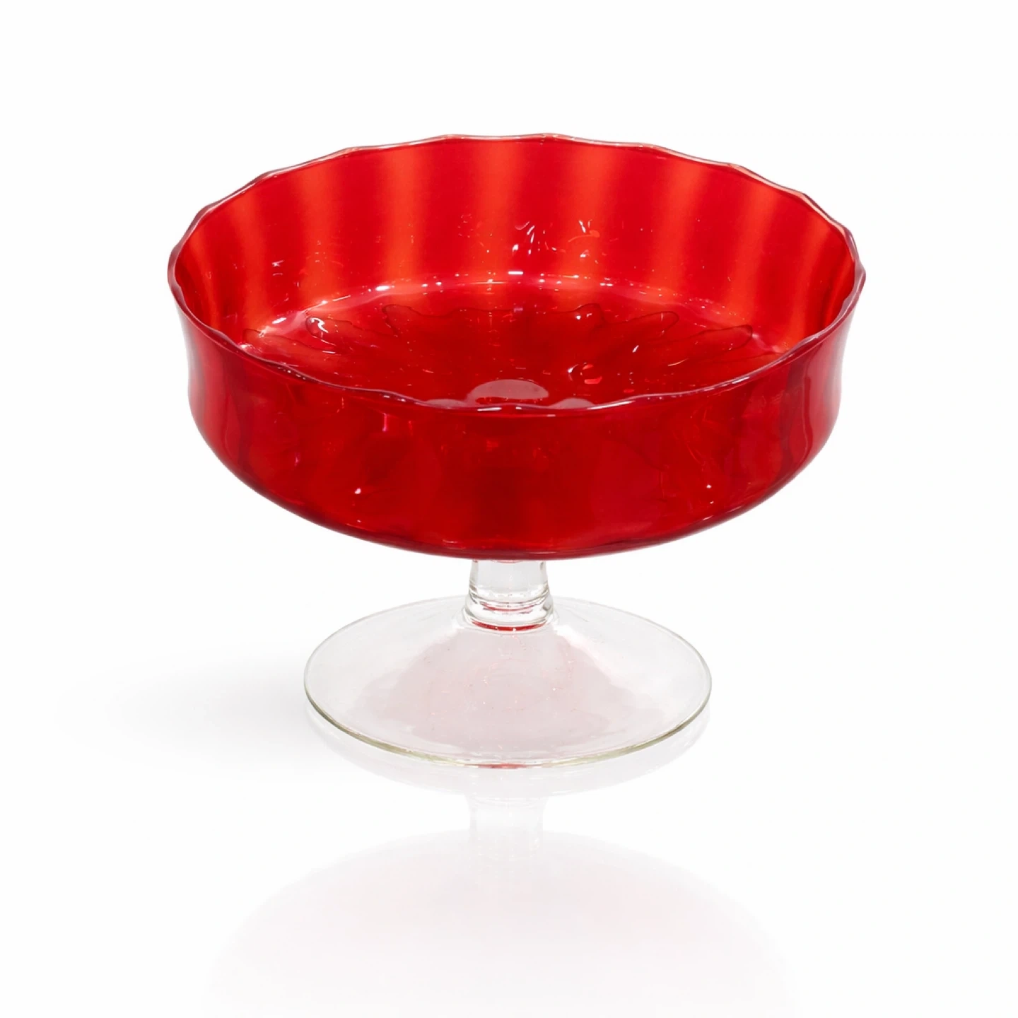 Hand-blown studio art glass pedestal compote, executed in saturated cranberry glass with subtle tangerine-orange striping that emerges along the rim and interior walls under strong light. The bowl features a sculptural, softly scalloped lip and is elevated on a clear stem with a wide, balanced foot—an elegant, display-forward form intended as a centerpiece or presentation bowl.
