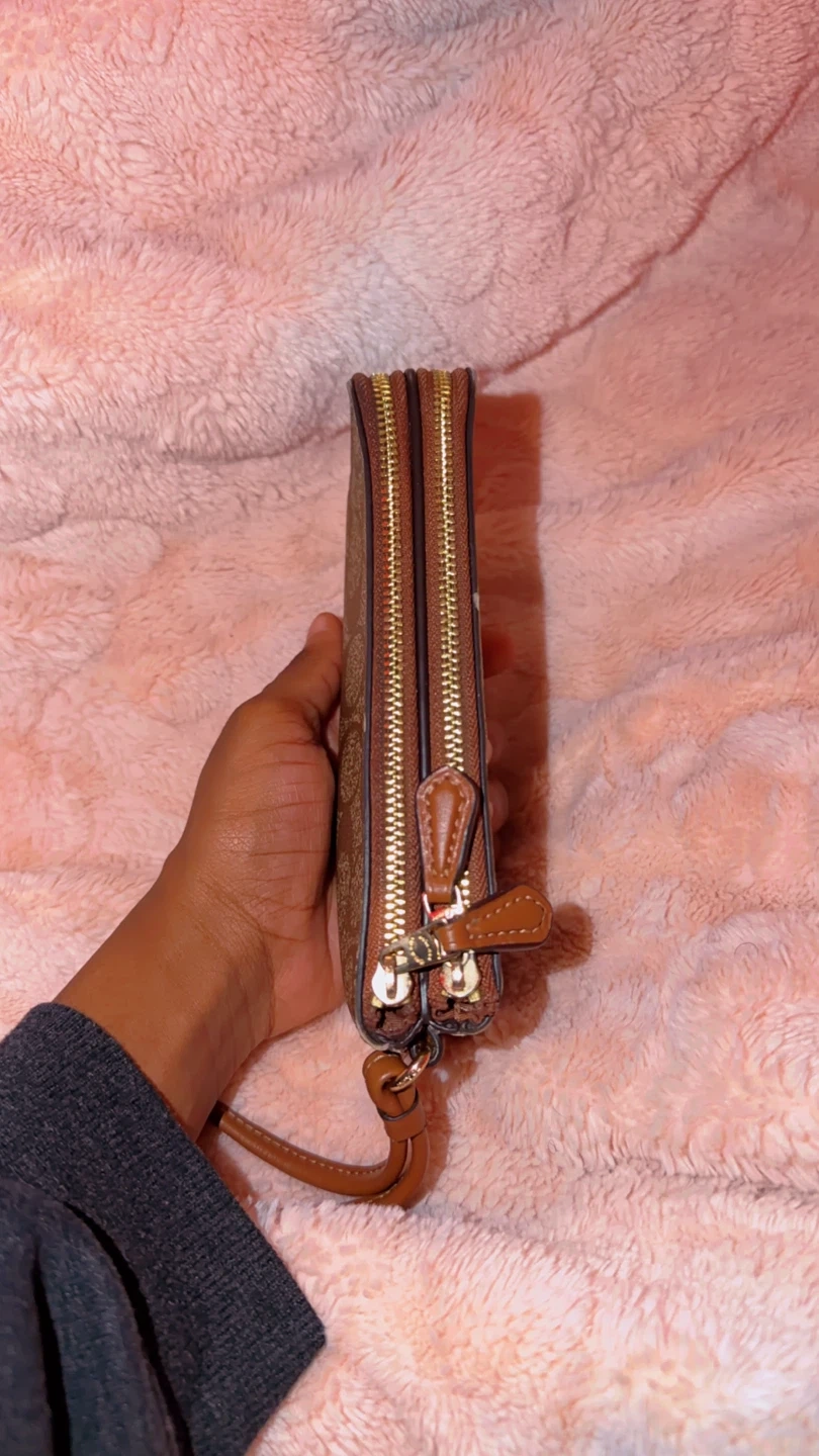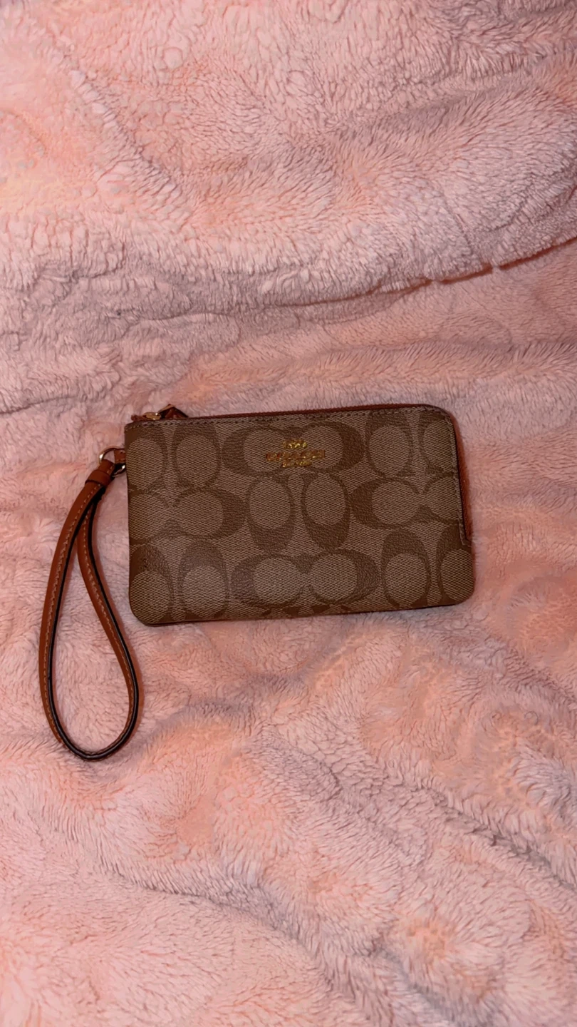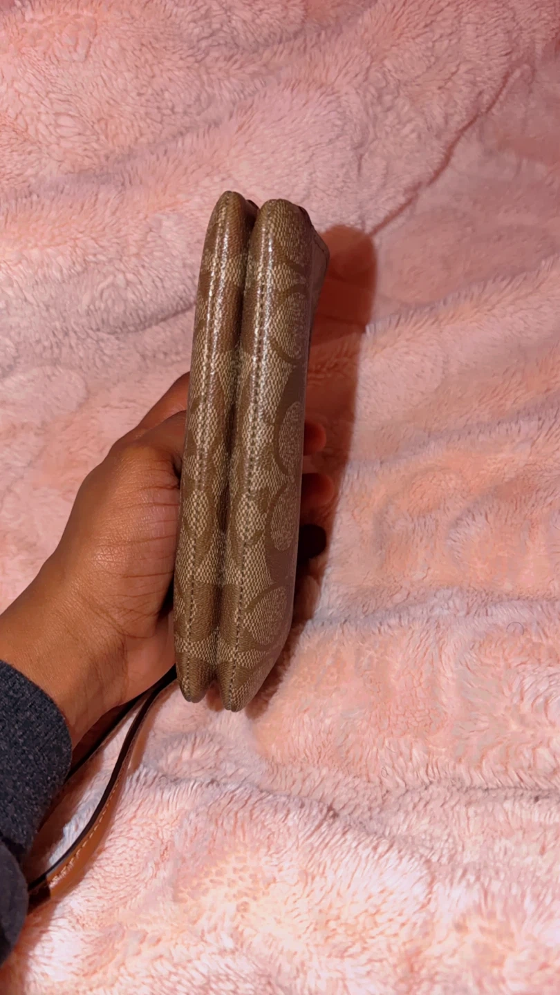 This Coach wristlet features the signature C pattern in brown and tan. It has a zip-around closure and a detachable leather wrist strap. It's perfect for carrying essentials like cards and keys.