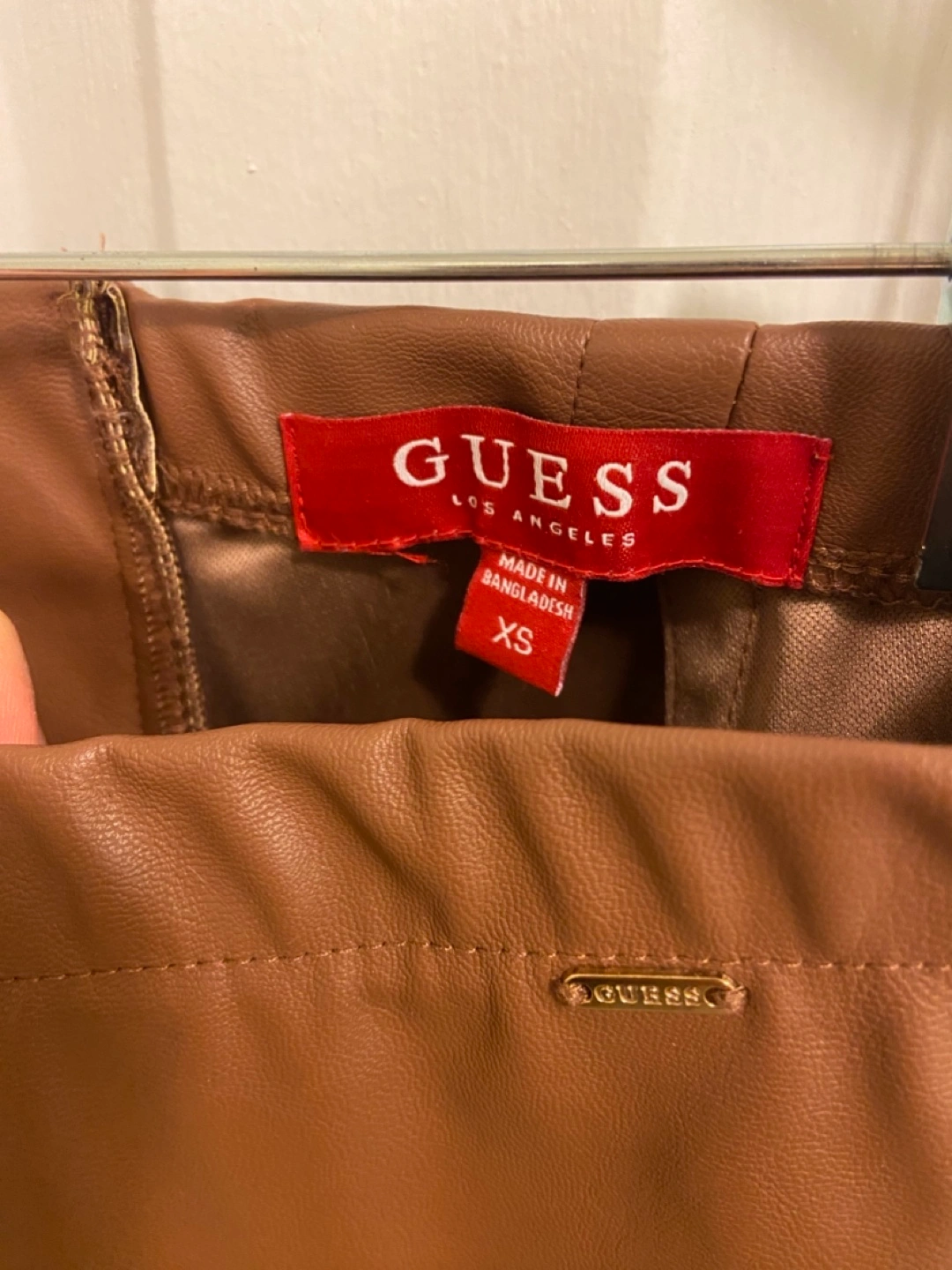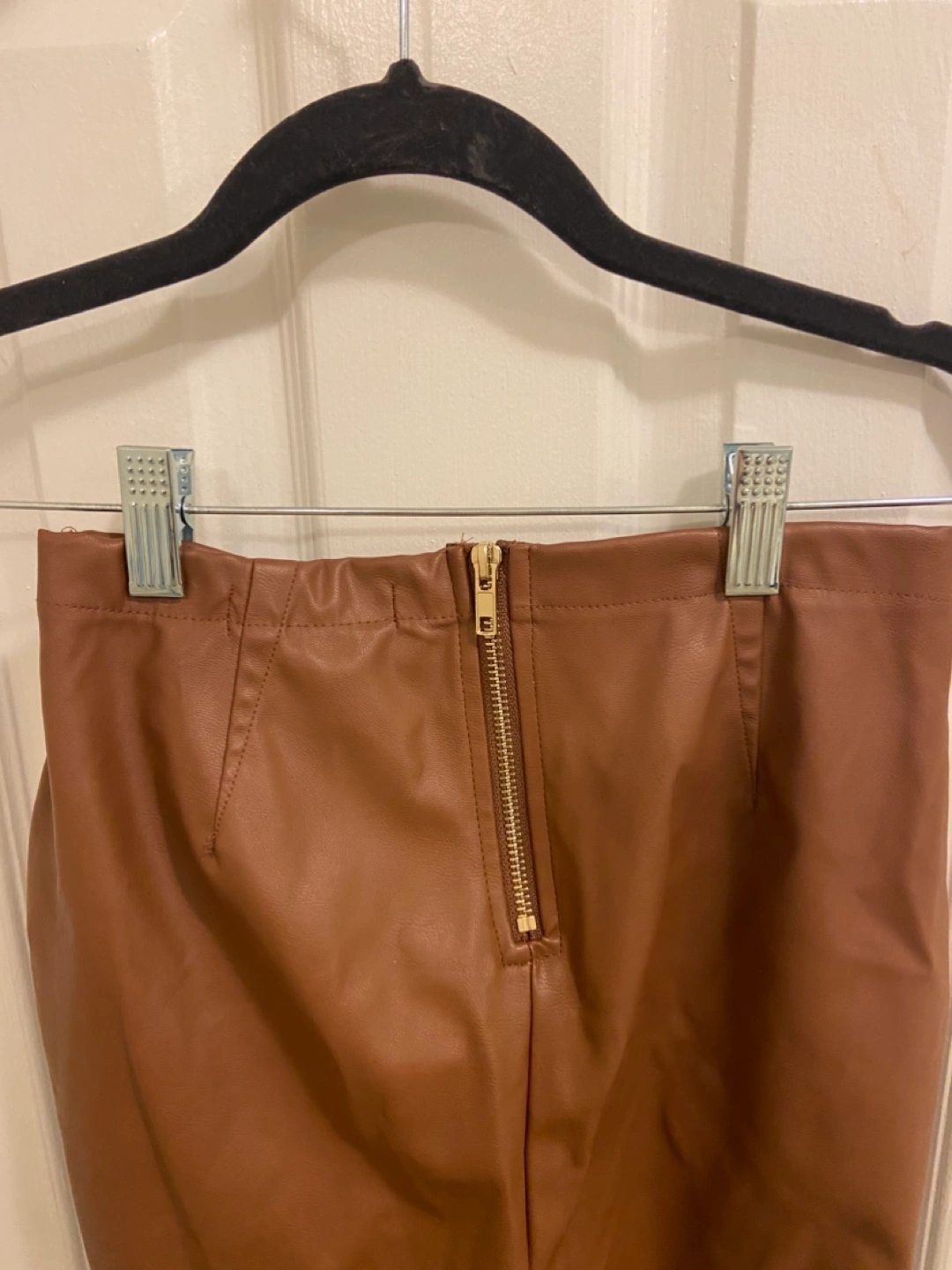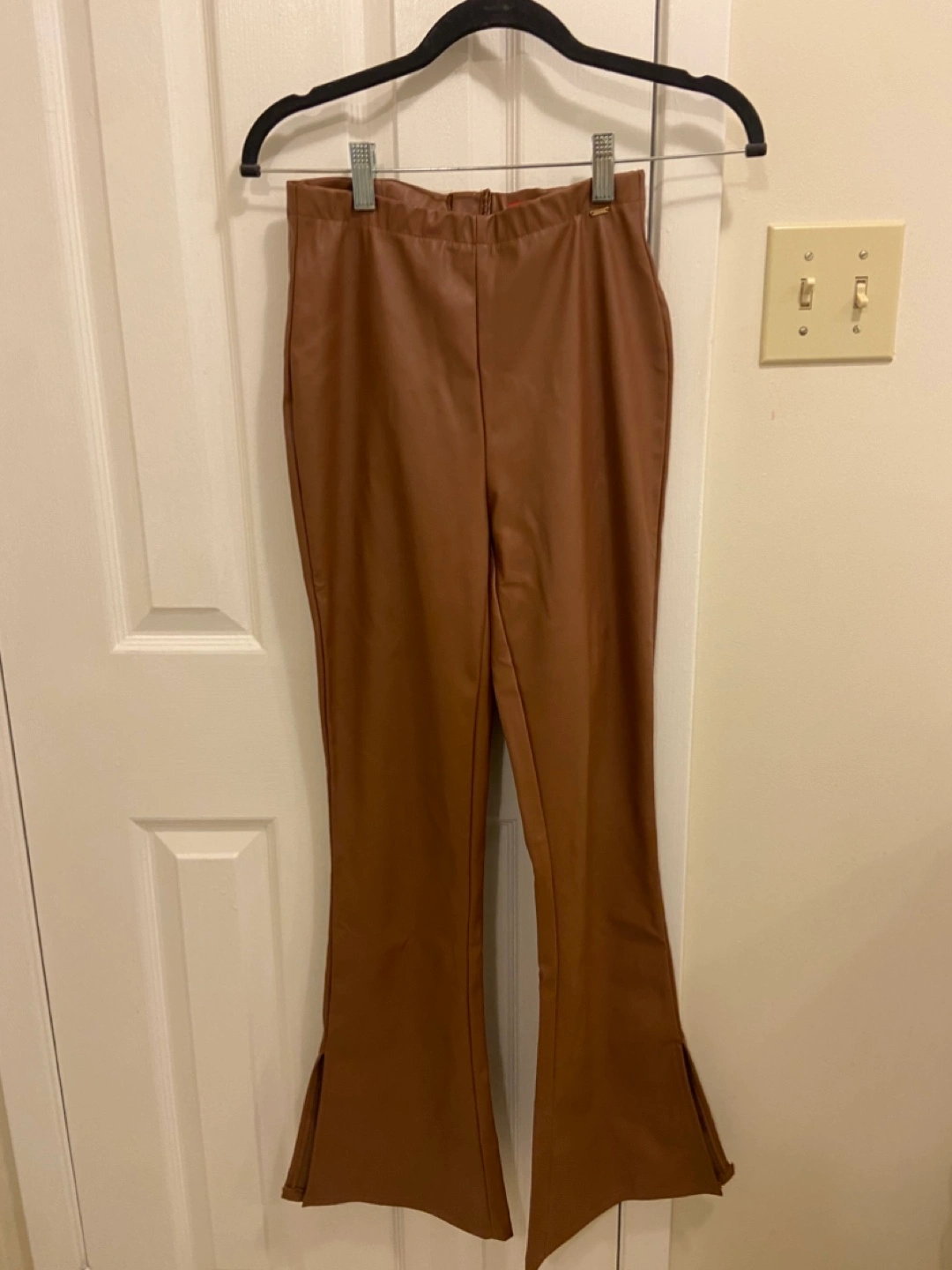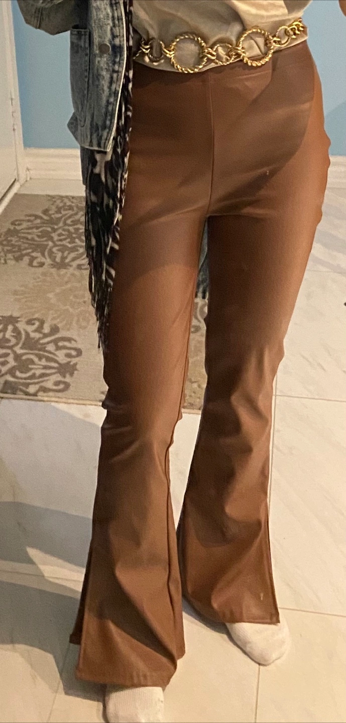 Stylish brown flare faux leather pants with zipper at the back. The flared ends have slits at both sides. Extra small but stretchy, can fit sizes 0-4 (I usually wear a 4 for comfort)