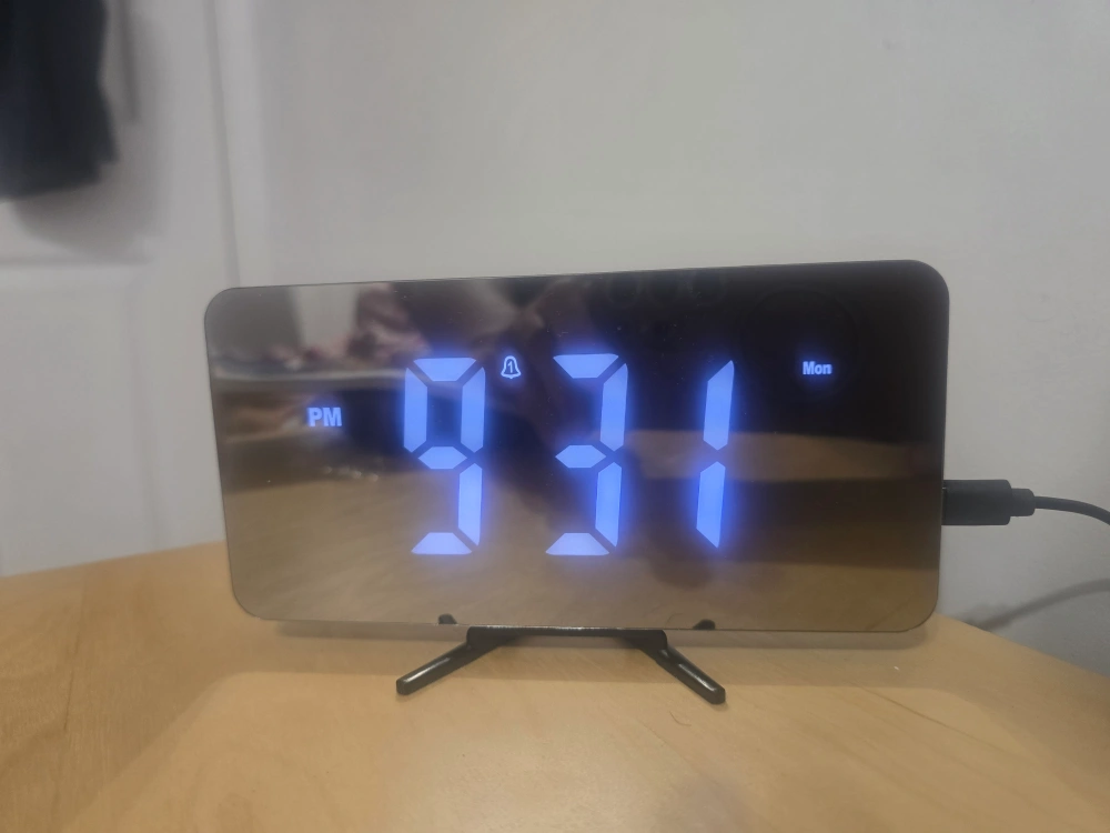 Selling a digital LED mirror alarm clock! It displays the time, day, and has an alarm function. It's in great condition and would look great on any bedside table.