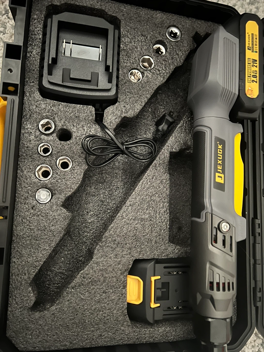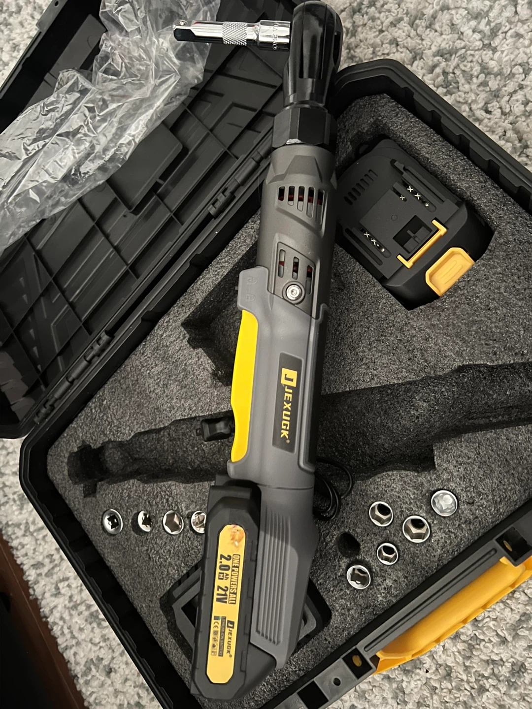 Selling a cordless electric ratchet wrench kit. It includes the wrench, charger, battery, and socket set, all in its original case. Great for DIY projects and auto repairs!