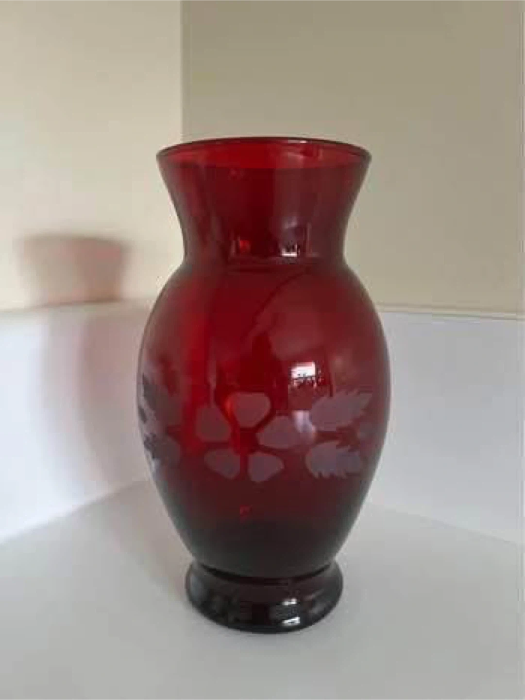 Beautiful ruby red glass vase. Features an etched floral pattern. Elegant addition to any home décor. Perfect for displaying fresh or dried flowers.