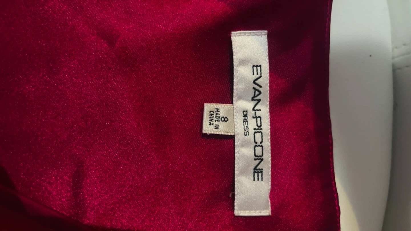 This is an EVAN PICONE dress with a V-neck and cap sleeves. It features a ruched waist detail. The material appears to be a satin blend. Size is 8.