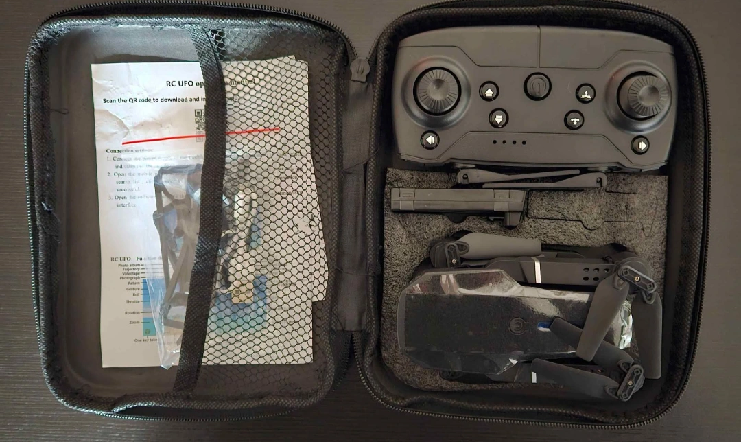 Foldable drone, dual camera. Includes remote, and carrying case. One battery included. Excellent for aerial photography and videography.