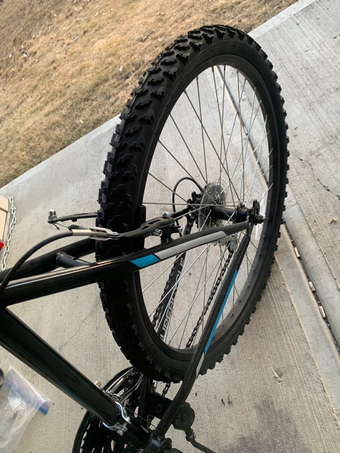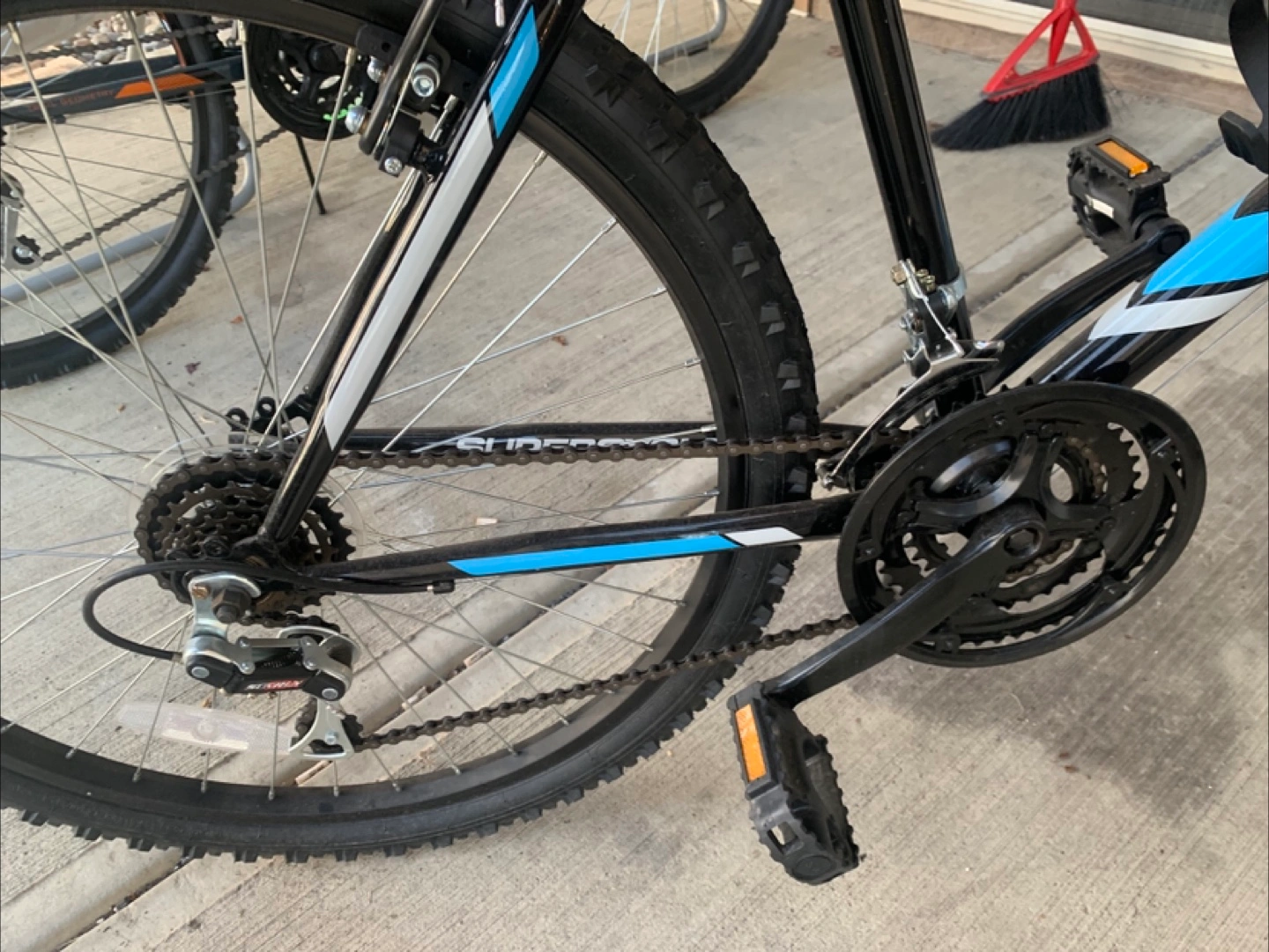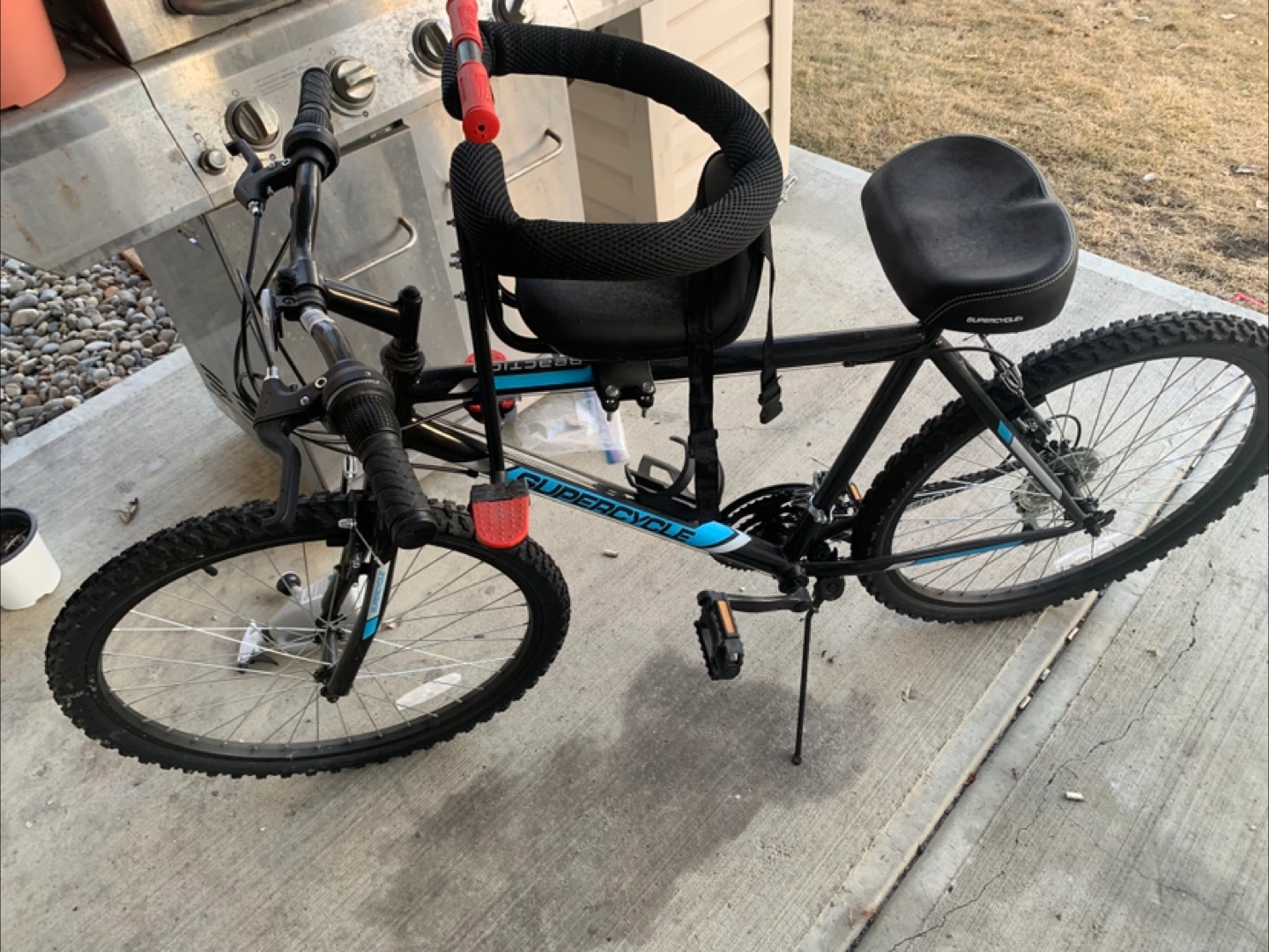 Black Supercycle bicycle with a front-mounted child seat. It features a durable frame and knobby tires. This bike is great for taking your little one along on rides! Child bike seat removable if not wanted but 25 if included brand new bike rode it a few times original seat included