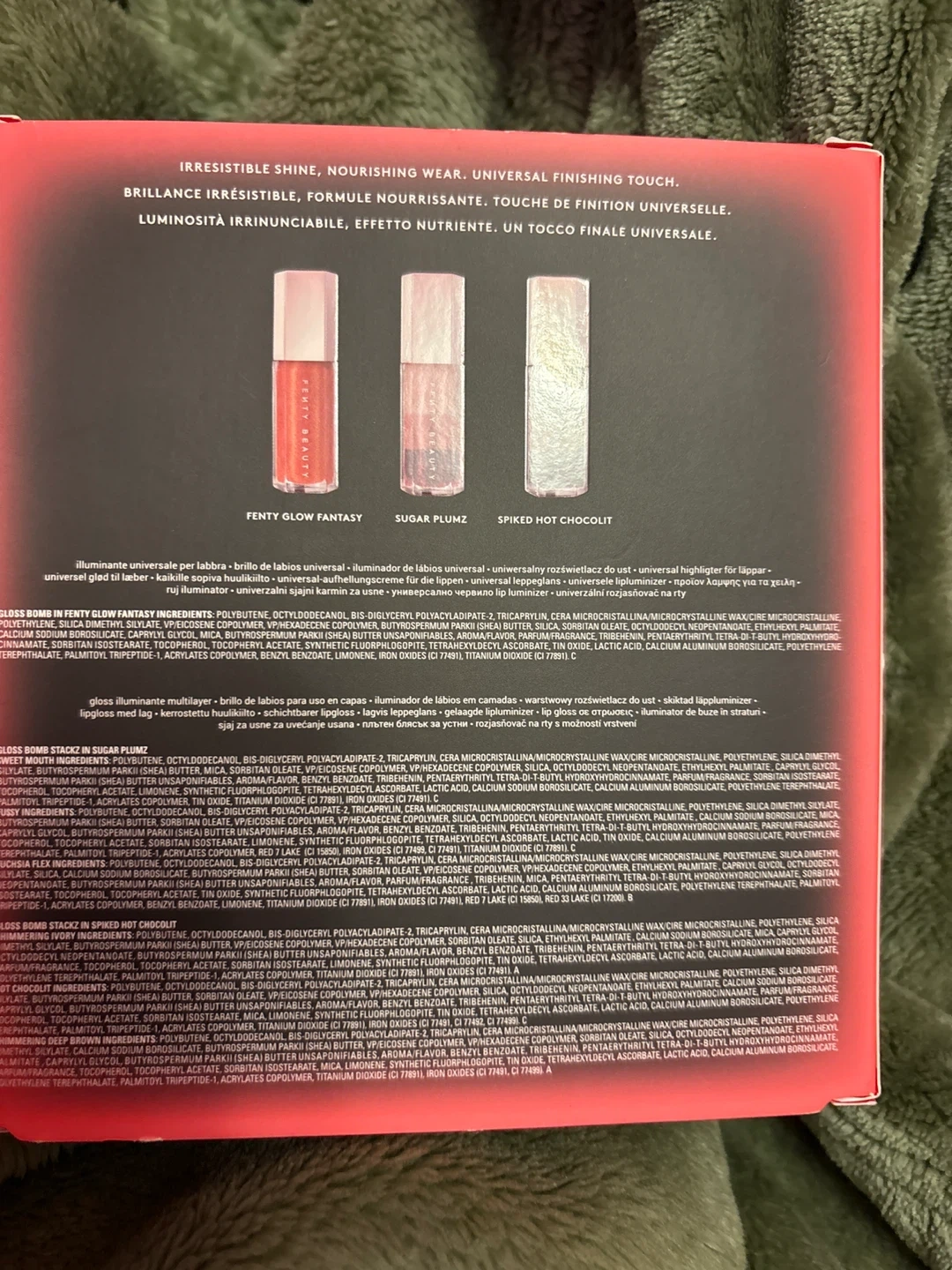 This Fenty Beauty set includes three lip luminizers: Gloss Bomb, Gloss Bomb Stackz, and Fenty Glow Fantasy. Each mini size is 3x0.9mL / 0.3 Fl. Oz. It's a versatile collection for achieving a glossy finish.