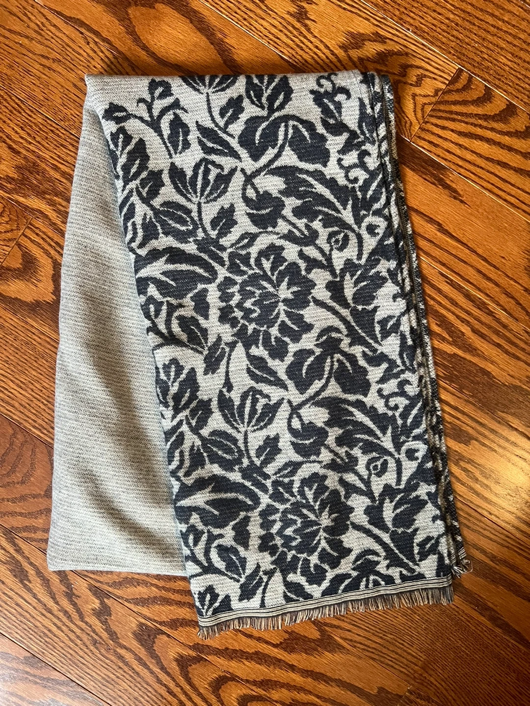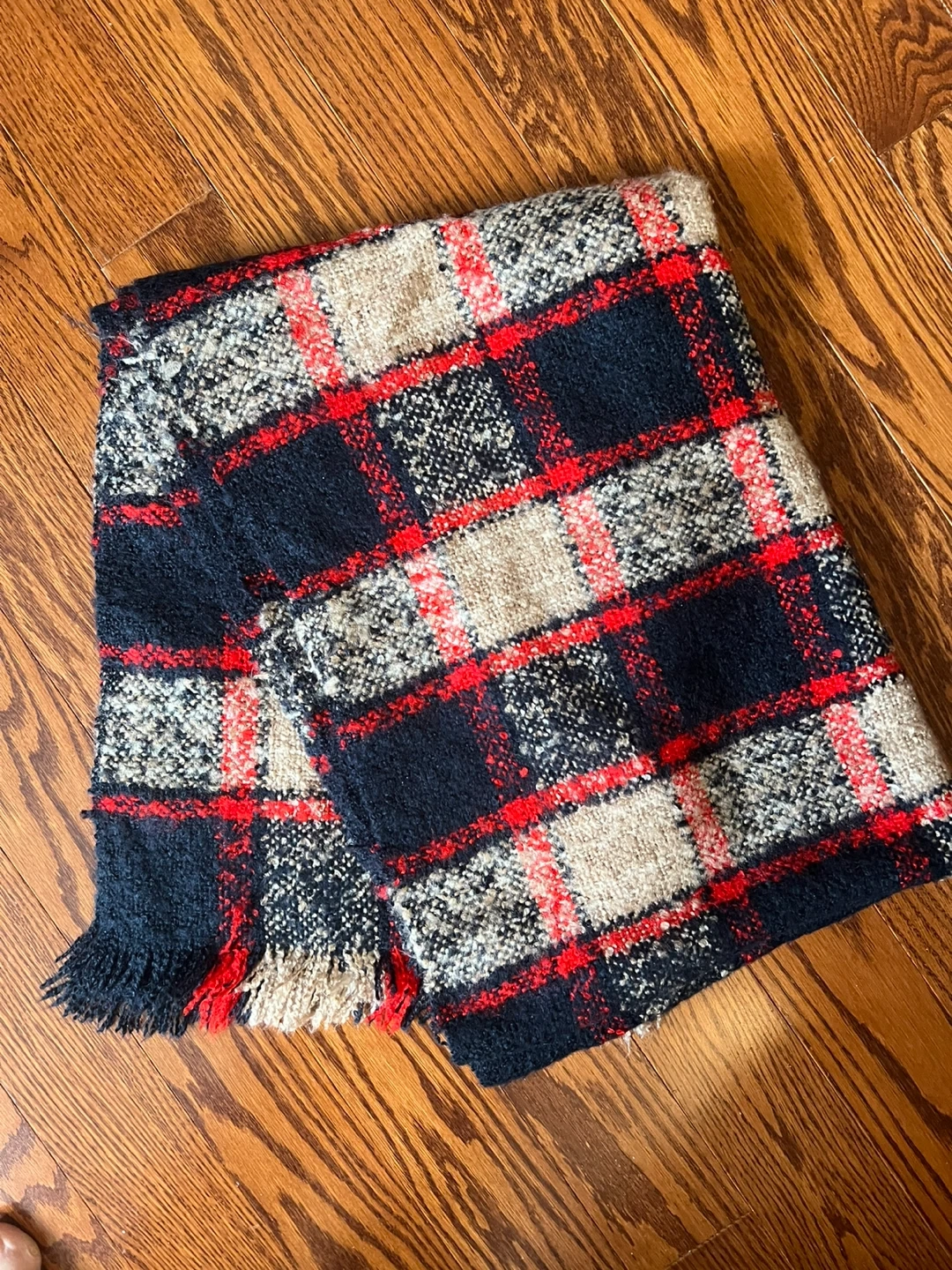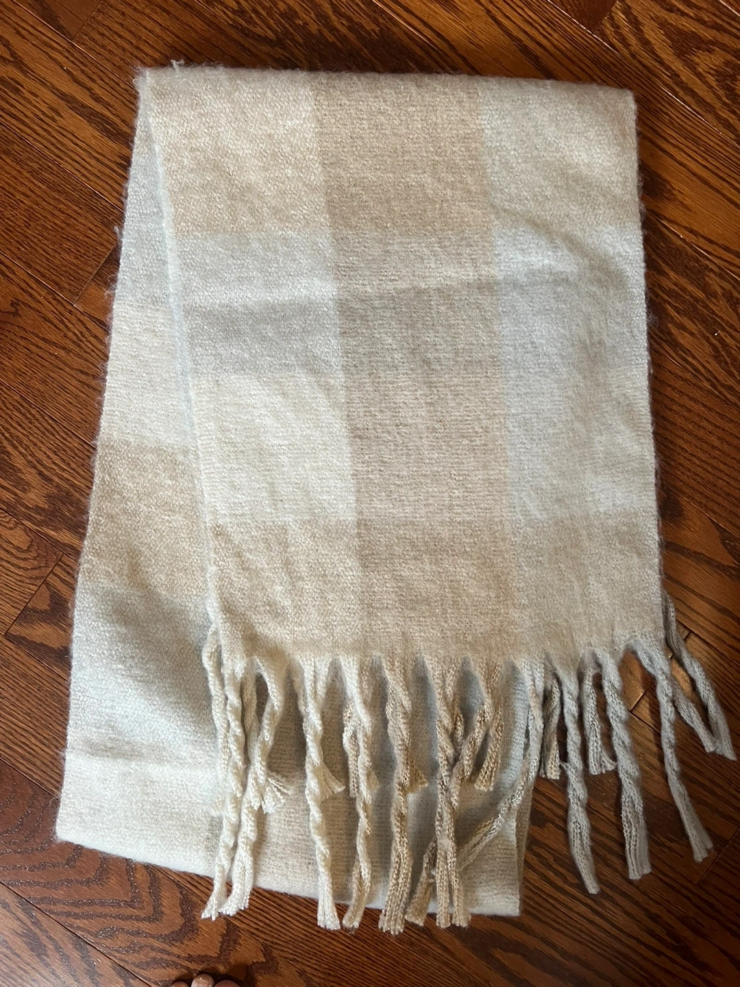 A cozy Love & Lore scarf with a cream base and subtle plaid pattern. It features a soft texture and fringed edges. Perfect for adding a touch of warmth and style to your outfit!