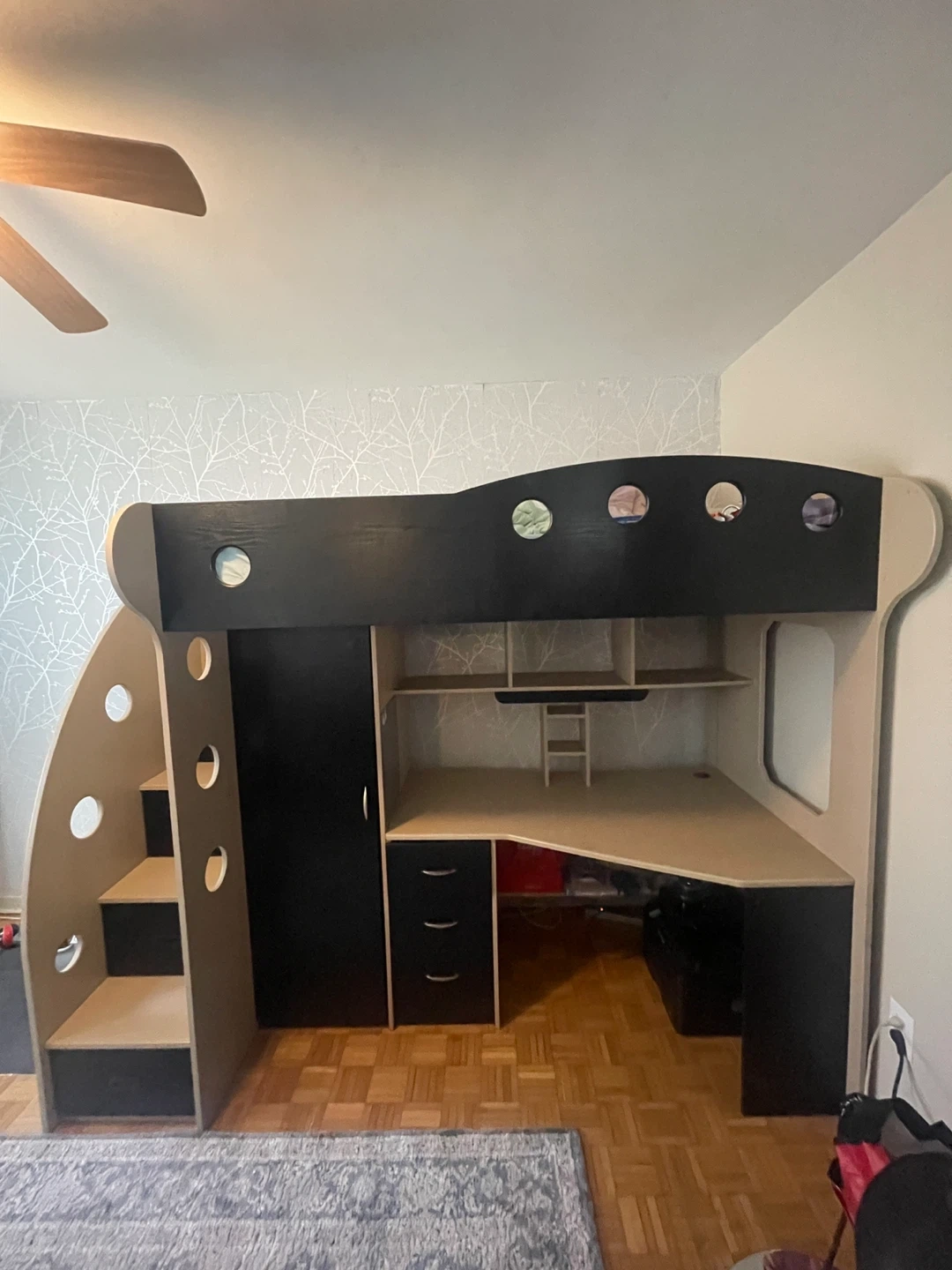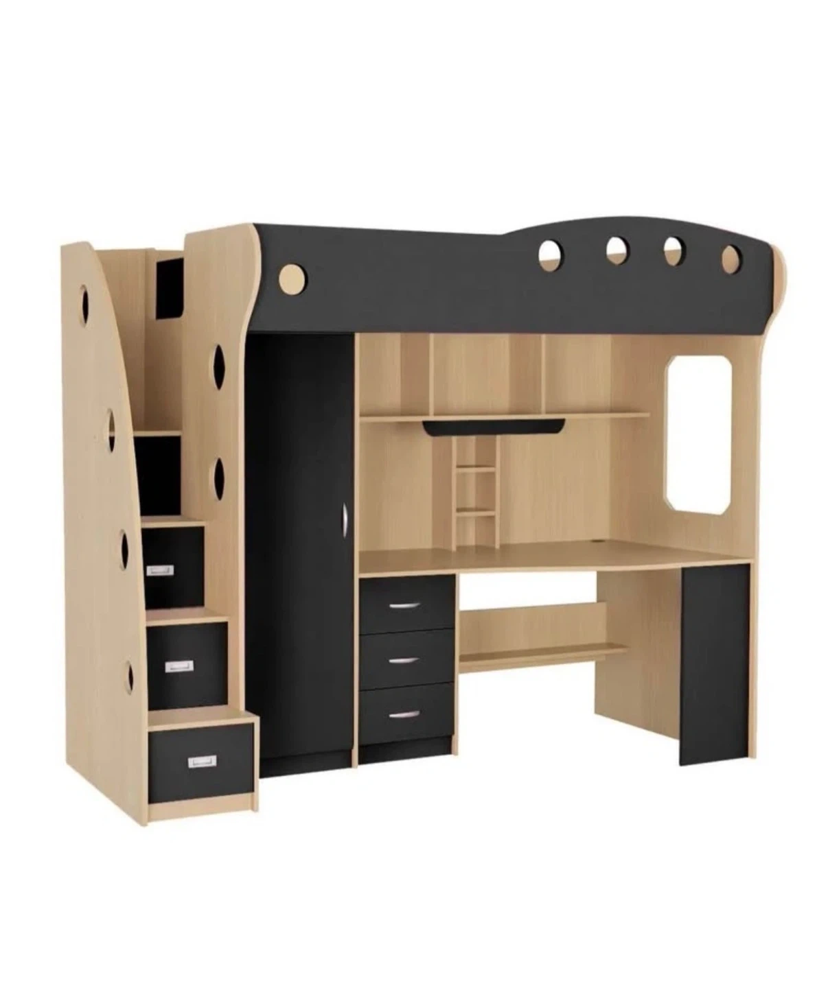 This loft bed comes complete with a desk and wardrobe, offering a clever space-saving solution. It features a built-in desk with drawers and shelving. The stairs are drawers too.
