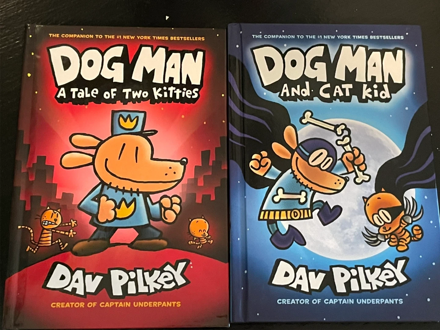 Includes Dog Man, Dog Man Unleashed, Dog Man: A Tale of Two Kitties, and Dog Man and Cat Kid. These graphic novels are by Dav Pilkey, creator of Captain Underpants. They're a fun read for kids! Hardcover.