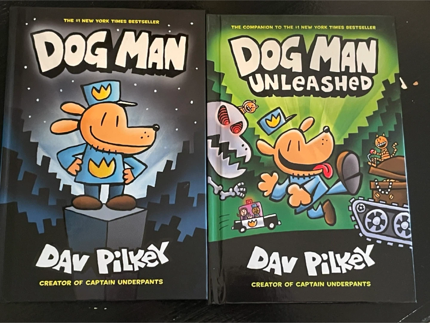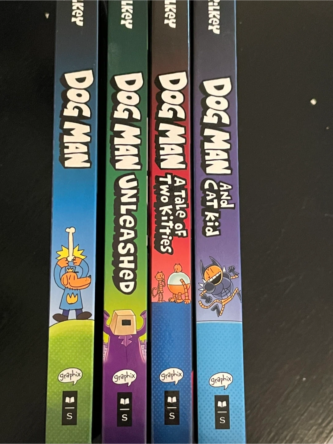 Includes Dog Man, Dog Man Unleashed, Dog Man: A Tale of Two Kitties, and Dog Man and Cat Kid. These graphic novels are by Dav Pilkey, creator of Captain Underpants. They're a fun read for kids! Hardcover.
