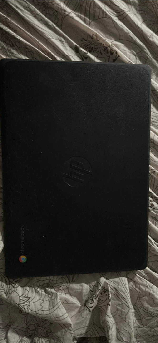 This is a black HP Chromebook laptop. It features a standard QWERTY keyboard and a trackpad. Great for schoolwork or everyday browsing!