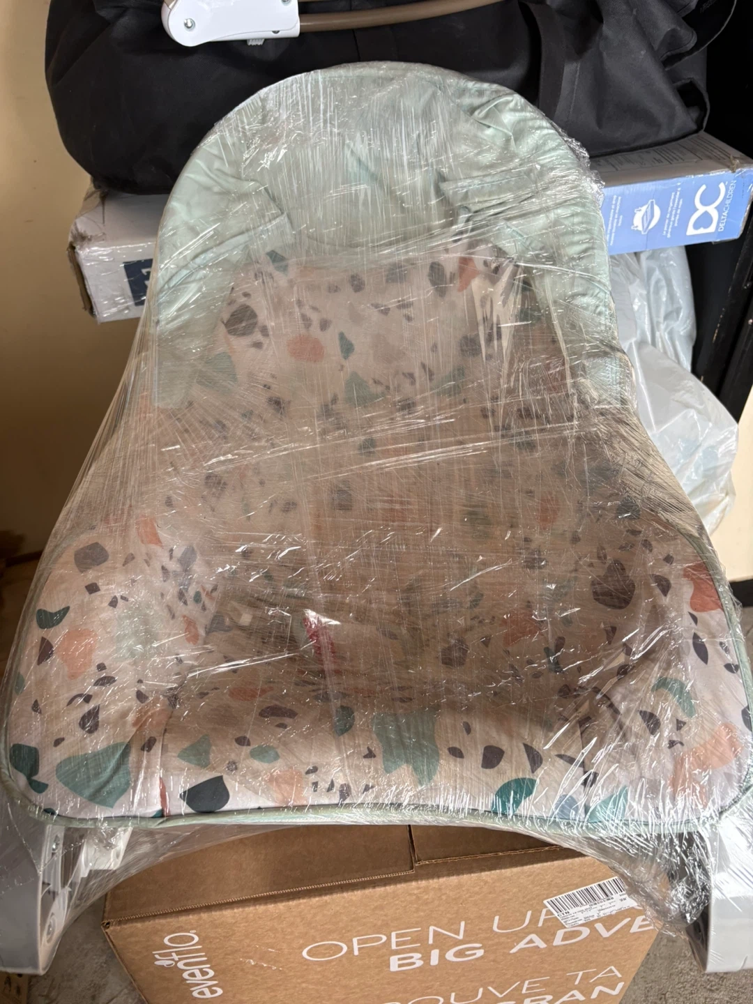 This baby rocker has a light green cover with a fun terrazzo pattern. It's designed for comfort and ease of use for little ones. Suitable for infants.
