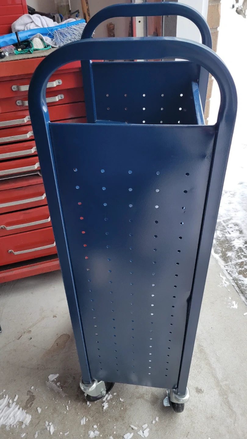 This blue book cart has three shelves and rolling casters. It's made of industrial metal and features handles for easy steering. Each shelf holds about 100lb.