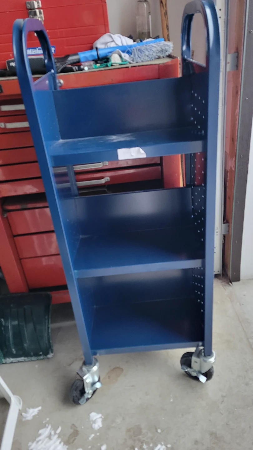 This blue book cart has three shelves and rolling casters. It's made of industrial metal and features handles for easy steering. Each shelf holds about 100lb.
