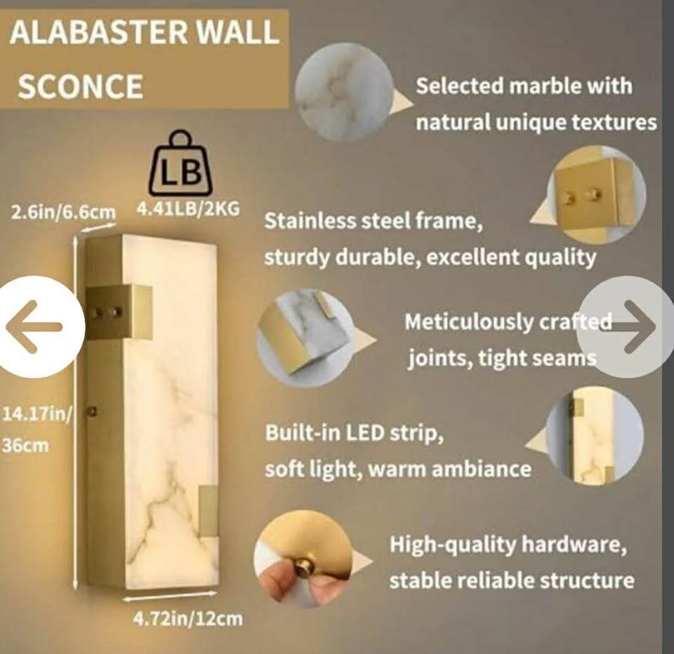 This is a Fuloyst Brass Natural Alabaster Wall Sconce, 14.17 inches tall. It's a modern, dimmable LED lamp featuring natural alabaster, sometimes described as Spanish Marble. It's suitable for bedrooms, living rooms, hallways, vanities, or stairs. Feel free to message if you have any questions!