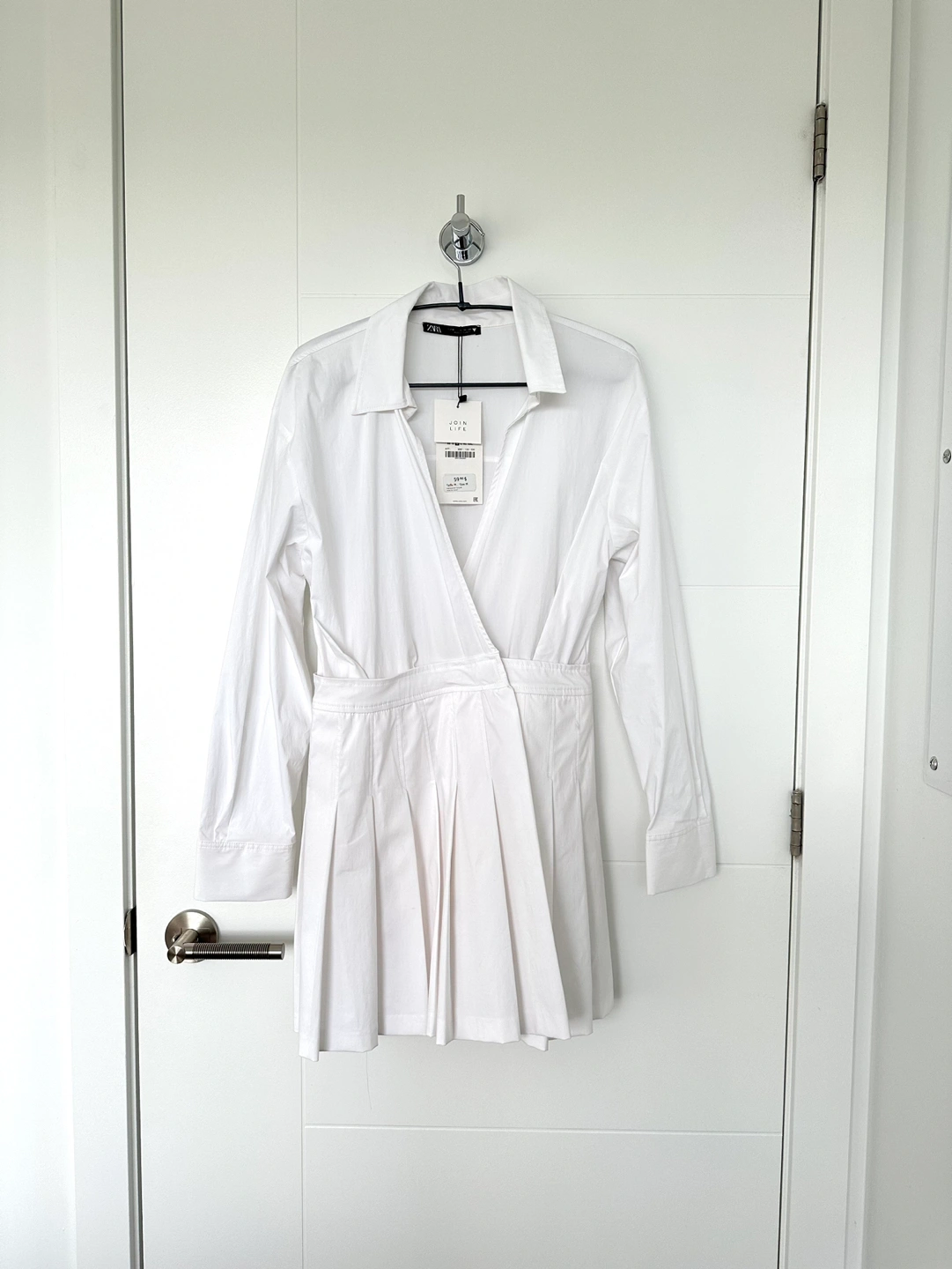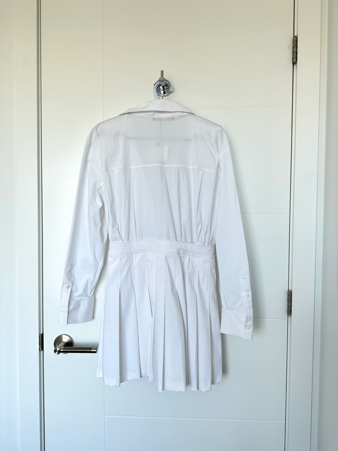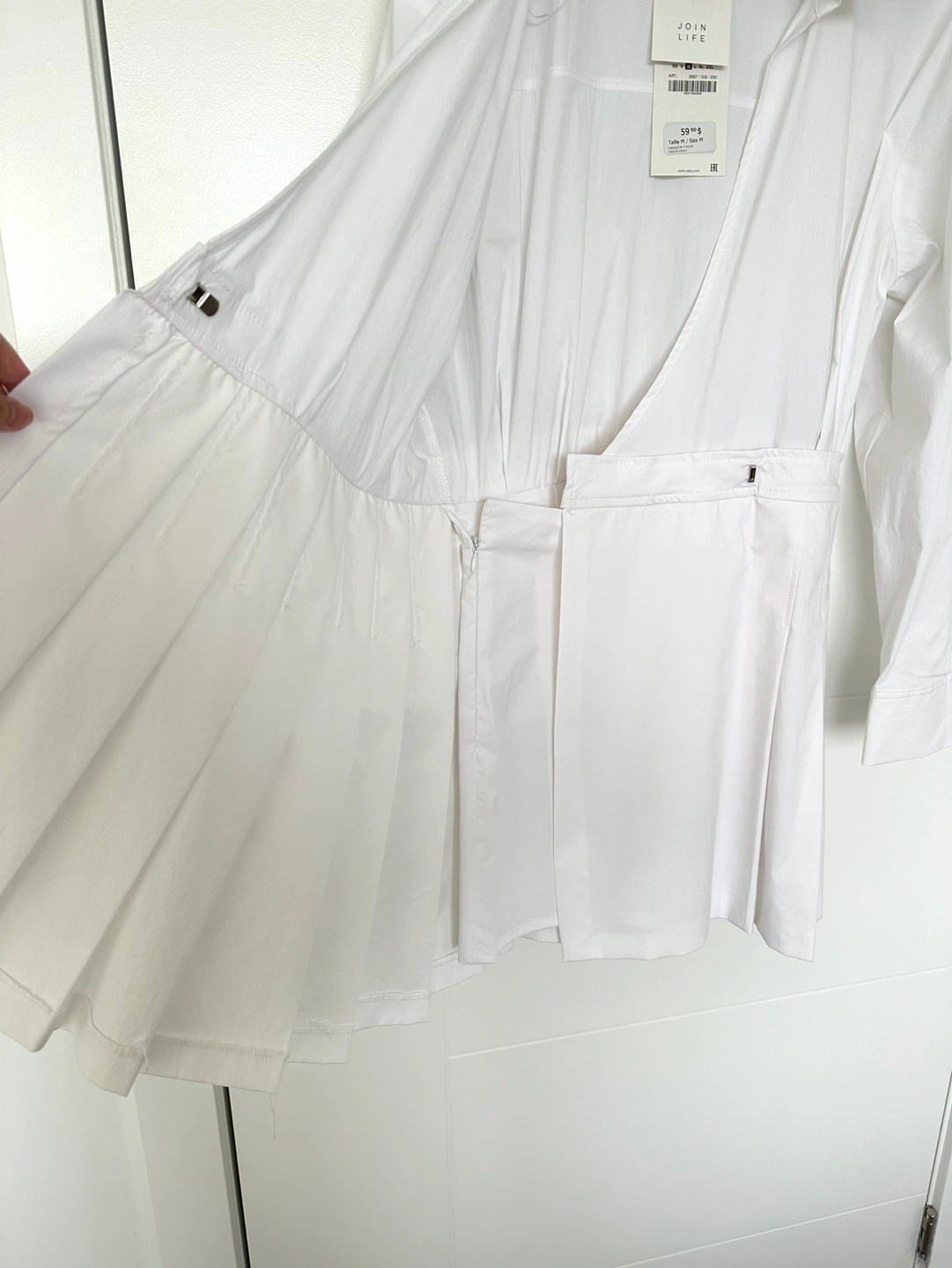 Never worn white jumpsuit dress that has a pleated skirt with clasp closure. There are shorts underneath with a side zip. Please check photos for details!