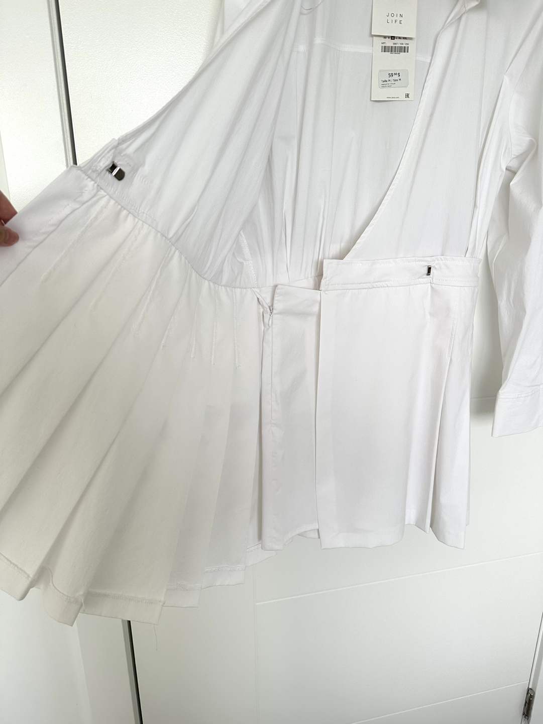 Never worn white jumpsuit dress that has a pleated skirt with clasp closure. There are shorts underneath with a side zip. Please check photos for details!