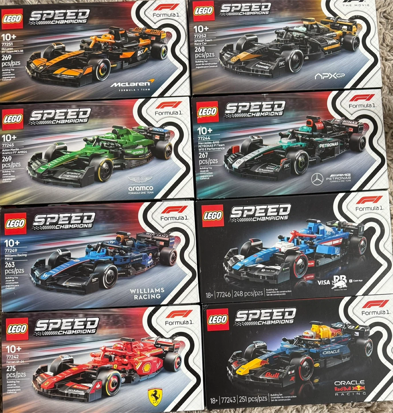 Collection of LEGO Speed Champions Formula 1 race cars, featuring McLaren, Aston Martin, Mercedes-AMG, and Williams Racing models. These sets offer detailed building experiences for fans of motorsport and LEGO. Great for display or play! 25$ each - price firm