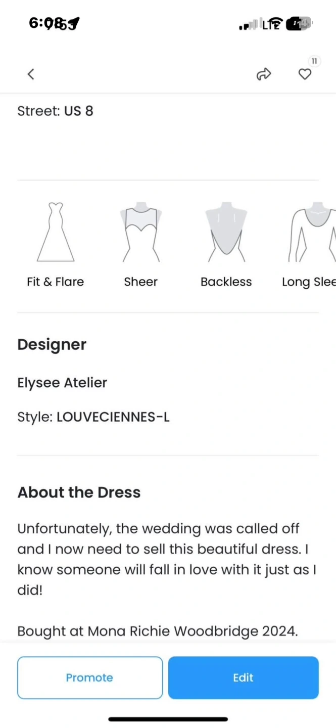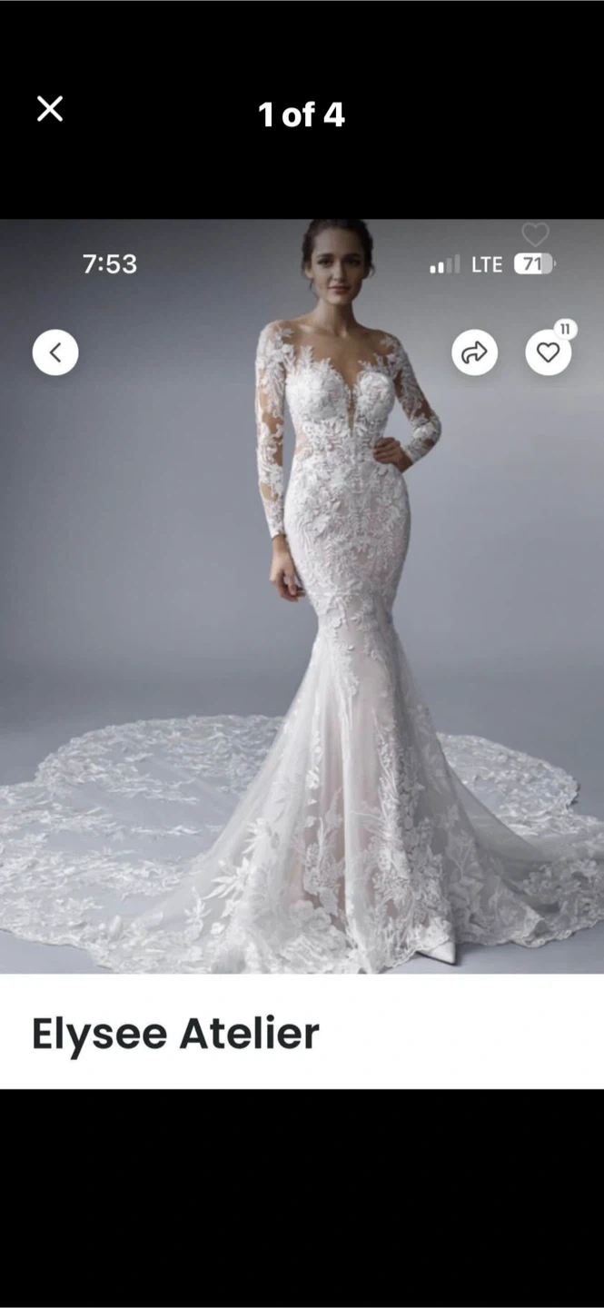 This is a beautiful lace wedding dress by Elysee Atelier. It's a US size 8 and has a stunning fit and flare silhouette. Alterations free if needed, purchased at Mona Richie
