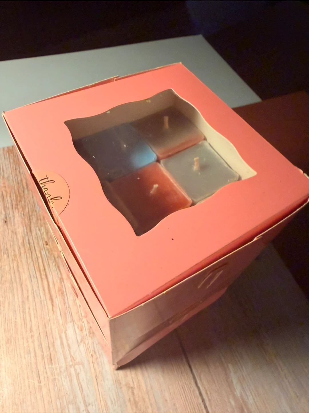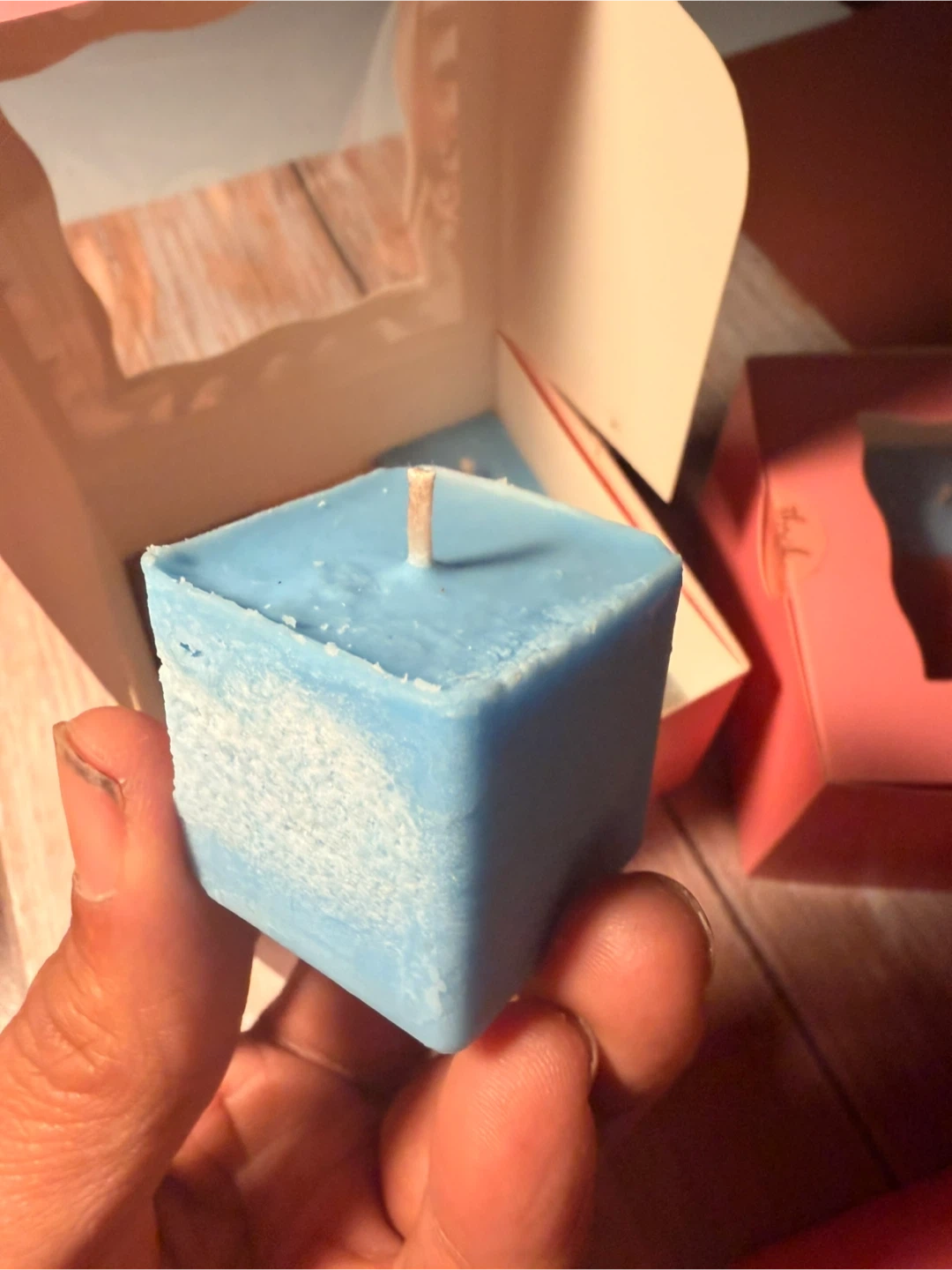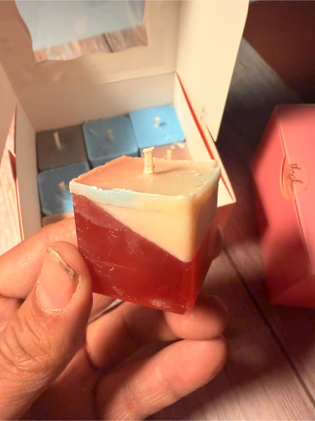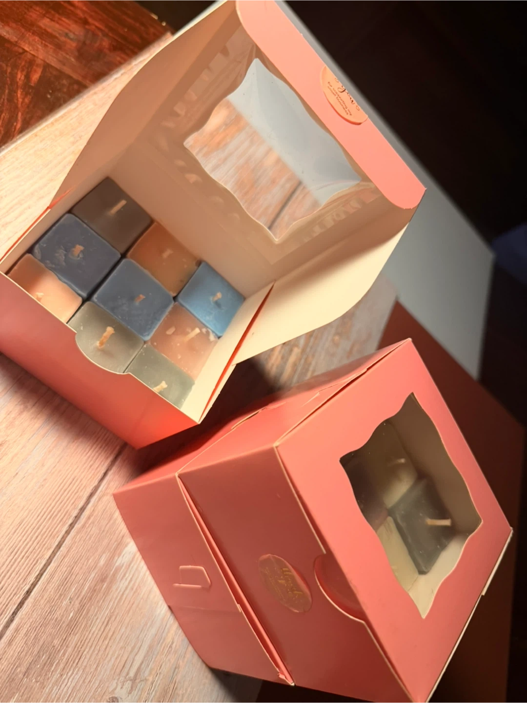 A collection of nine scented cube candles in various colors. These candles come in a pink gift box with a clear window display. Each candle is roughly cube-shaped and appears to be made of wax. They're perfect for adding a touch of ambiance to any room!