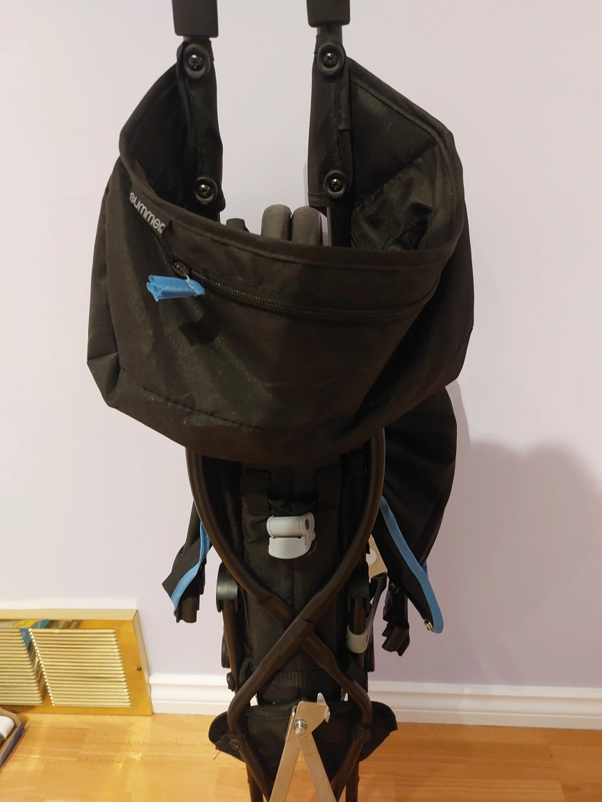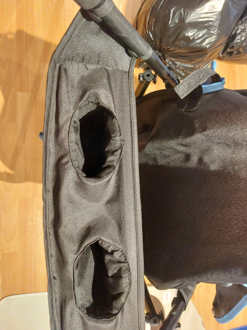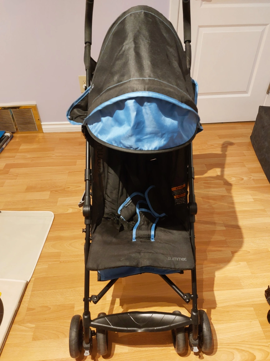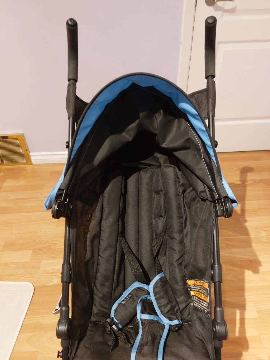 Blue and black stroller with a canopy, cup holders and a five-point harness. It folds up compactly.