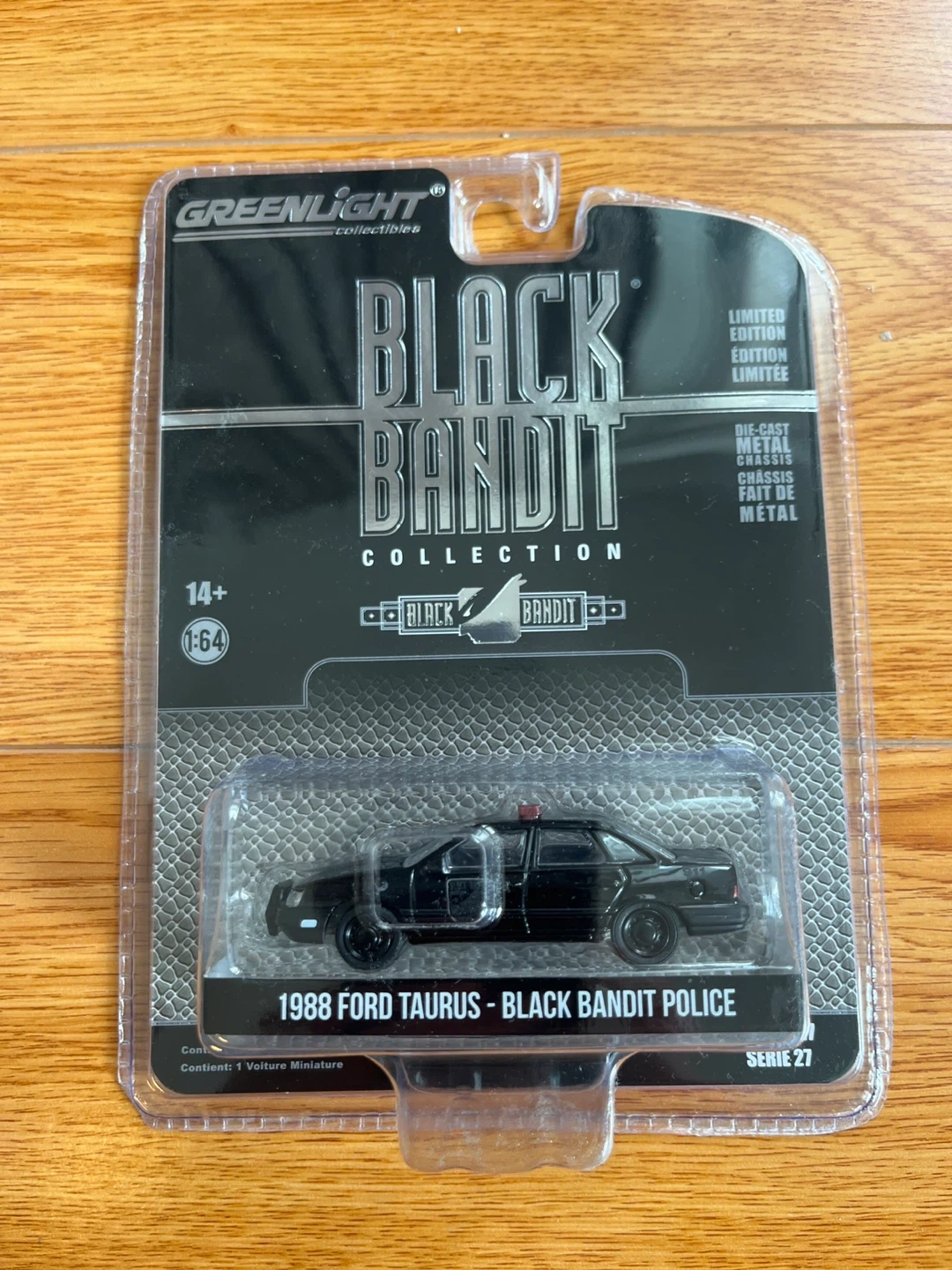 This is a Greenlight 1:64 scale die-cast model of a 1988 Ford Taurus Black Bandit police car. It's part of the Limited Edition collection. The vehicle is made with a die-cast metal chassis.