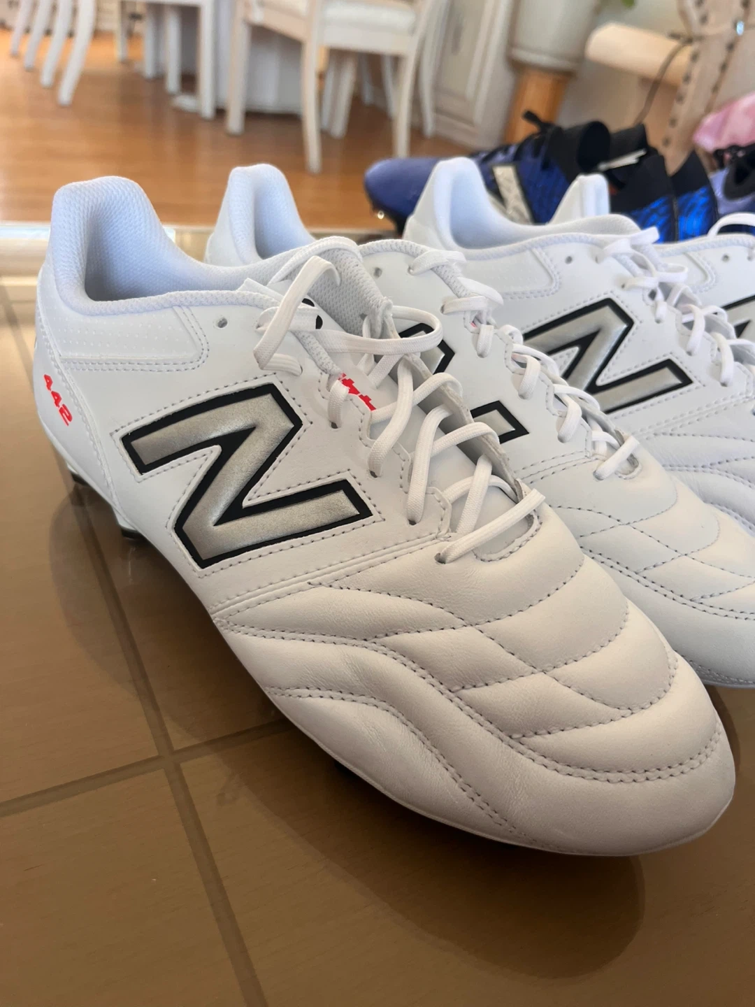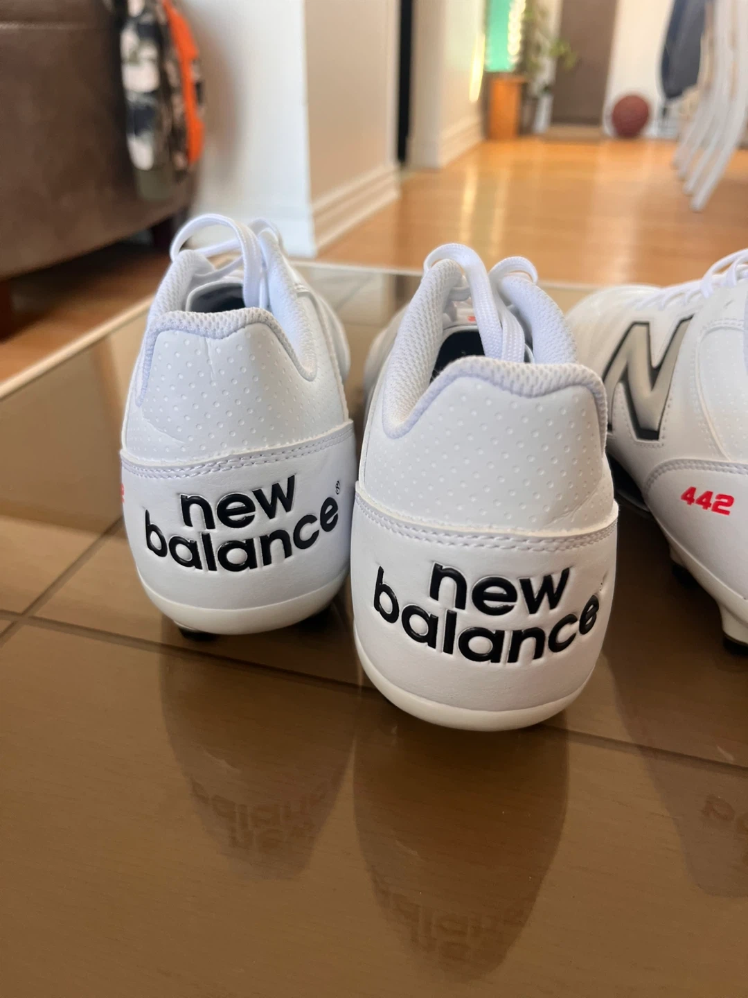 New Balance 442 soccer cleats in white. These cleats are designed for performance on the field. They feature a durable synthetic upper for a great touch on the ball. Perfect for players looking for reliable cleats!