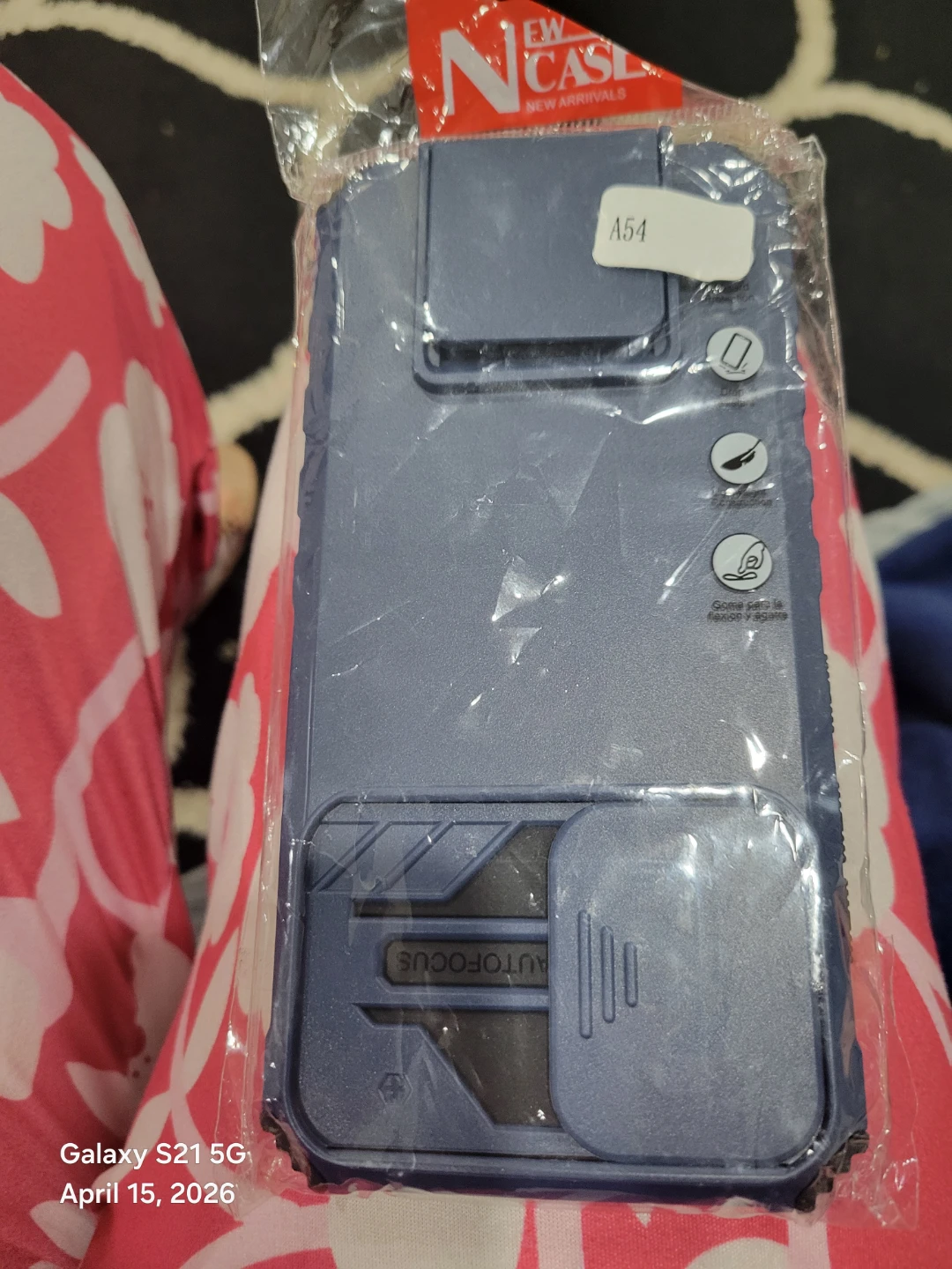 Protective case for Samsung Galaxy S21 5G with an autofocus camera cover. Made of durable material in a blue colour. A54 model designation on sticker.