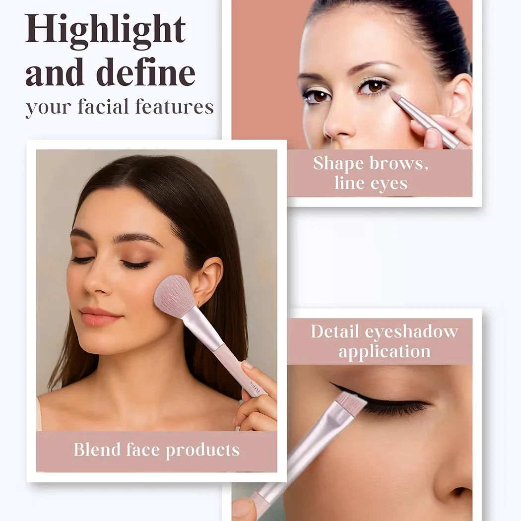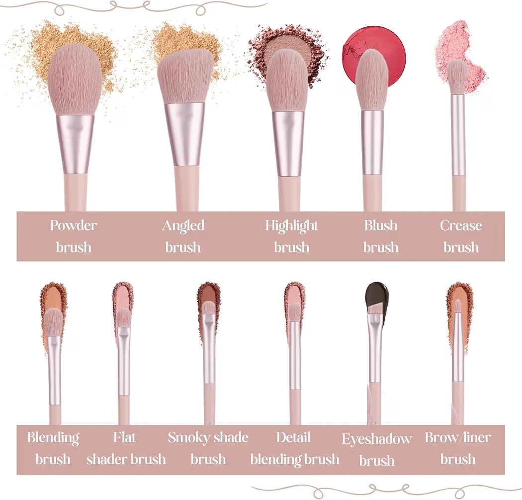 This 11-piece makeup brush set features soft and dense bristles with ergonomic, durable handles. It includes a variety of brushes for all your makeup needs, such as powder, angled, highlight, blush, crease, blending, flat shader, smoky shade, detail blending, eyeshadow, and brow liner brushes. Comes with a sleek storage pouch.