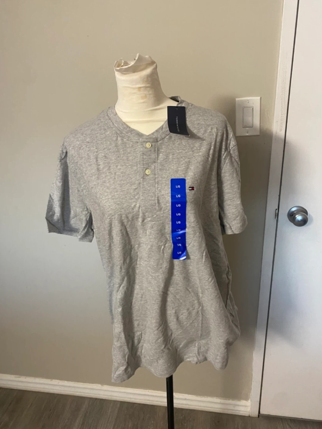 Brand new with tags Tommy Hilfiger men's grey henley t-shirt. Short sleeve, two-button placket. Made of soft cotton blend. This shirt is great for casual wear.