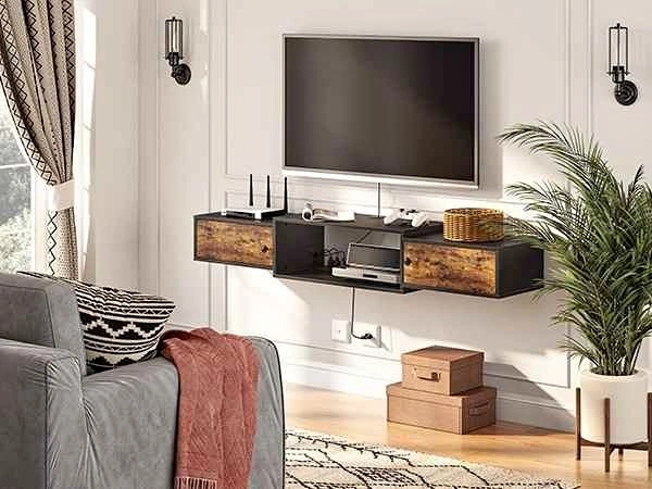 Wall Mounted TV Stand with Power Outlets: With 4 standard plugs, the floating TV stand is extremely suitable for use with TVs, game consoles, WiFi router, DVDs, CD players, etc., easy charging for your media components