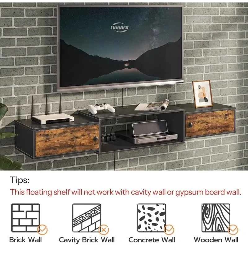 Easy Setup: With high-quality accessories, this floating entertainment center is applicable for concrete walls, wood walls and brick walls (not for cavity walls and gypsum board wall
