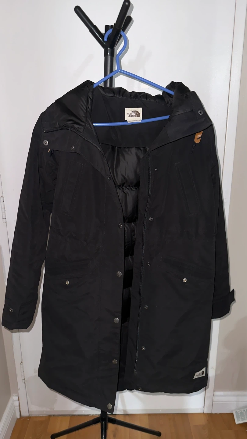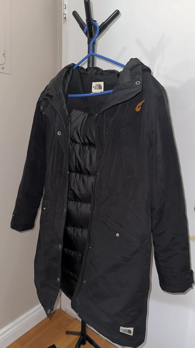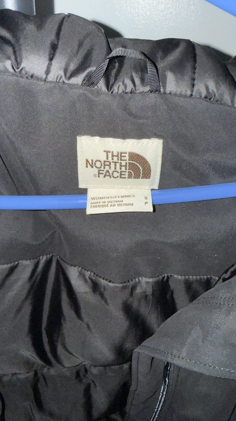 The North Face black parka jacket for women. It's a size small and made in Vietnam. This jacket is insulated and features a hood.