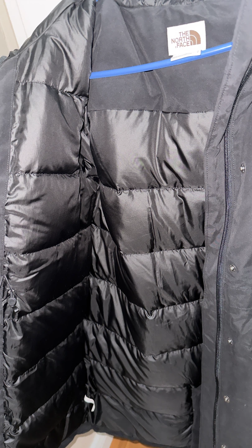 The North Face black parka jacket for women. It's a size small and made in Vietnam. This jacket is insulated and features a hood.