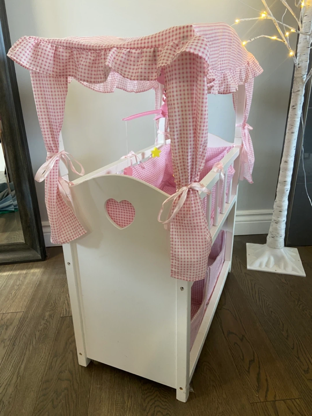 The set is finished in white with pink gingham fabric accents