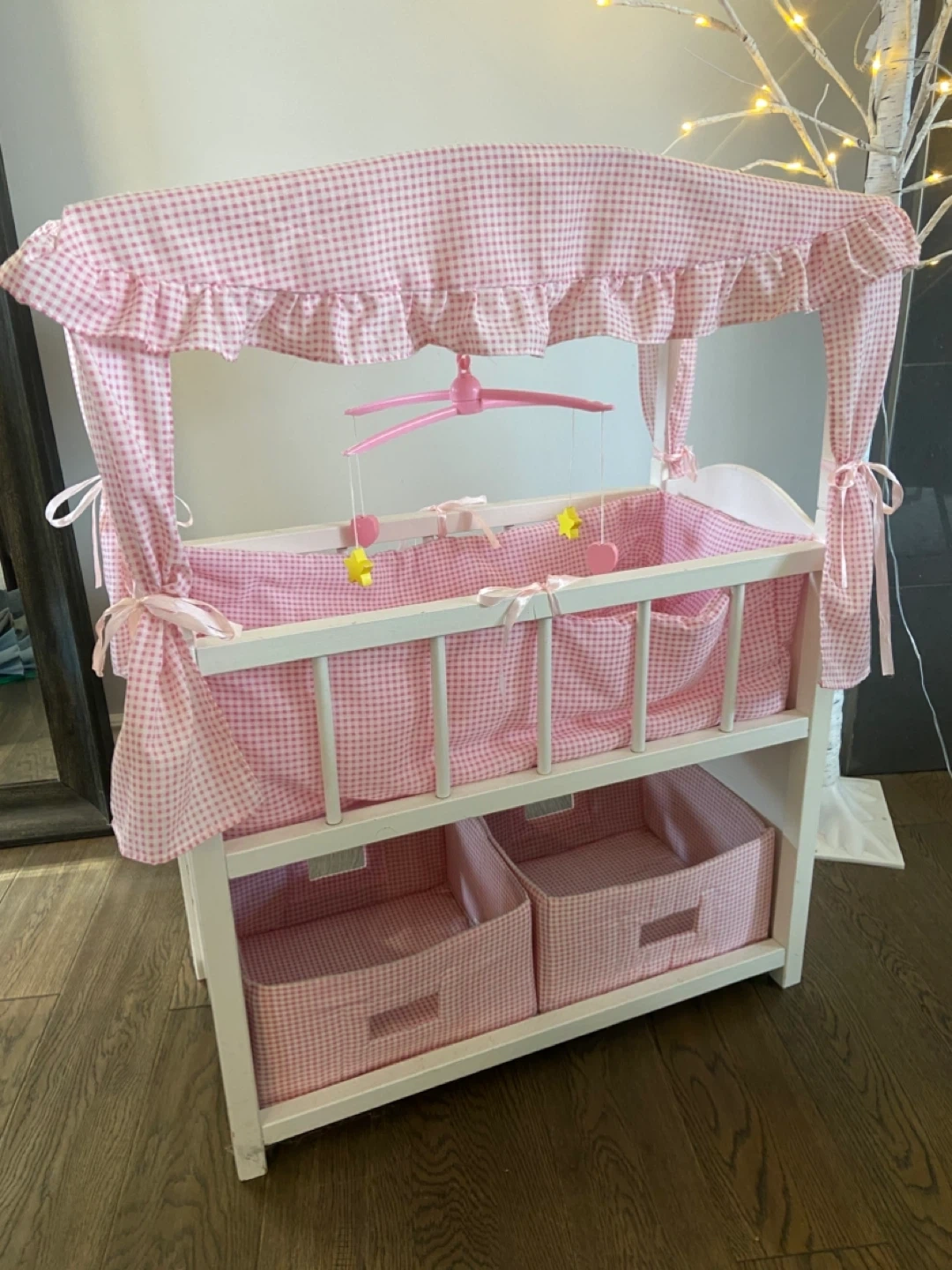This adorable wooden doll nursery set features a crib with a mobile and a matching high chair. It includes two storage bins for accessories
